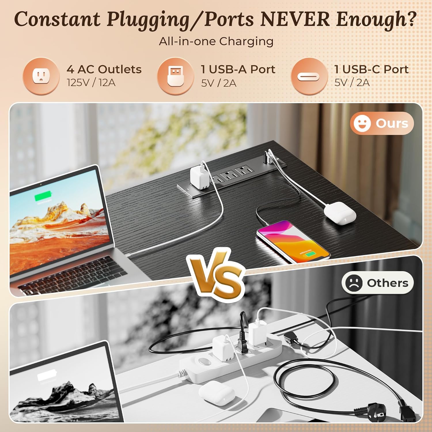 - 【Home Office Desk with Charging Station】No more crawling under the desk for plugs. This PC desk for home office includes 4 AC outlets, 1 USB-A port, and 1 USB-C port, perfect for powering everything from your laptop and monitor to your phone, tablet, or desk lamp. Charge everything without leaving your seat with this study desk