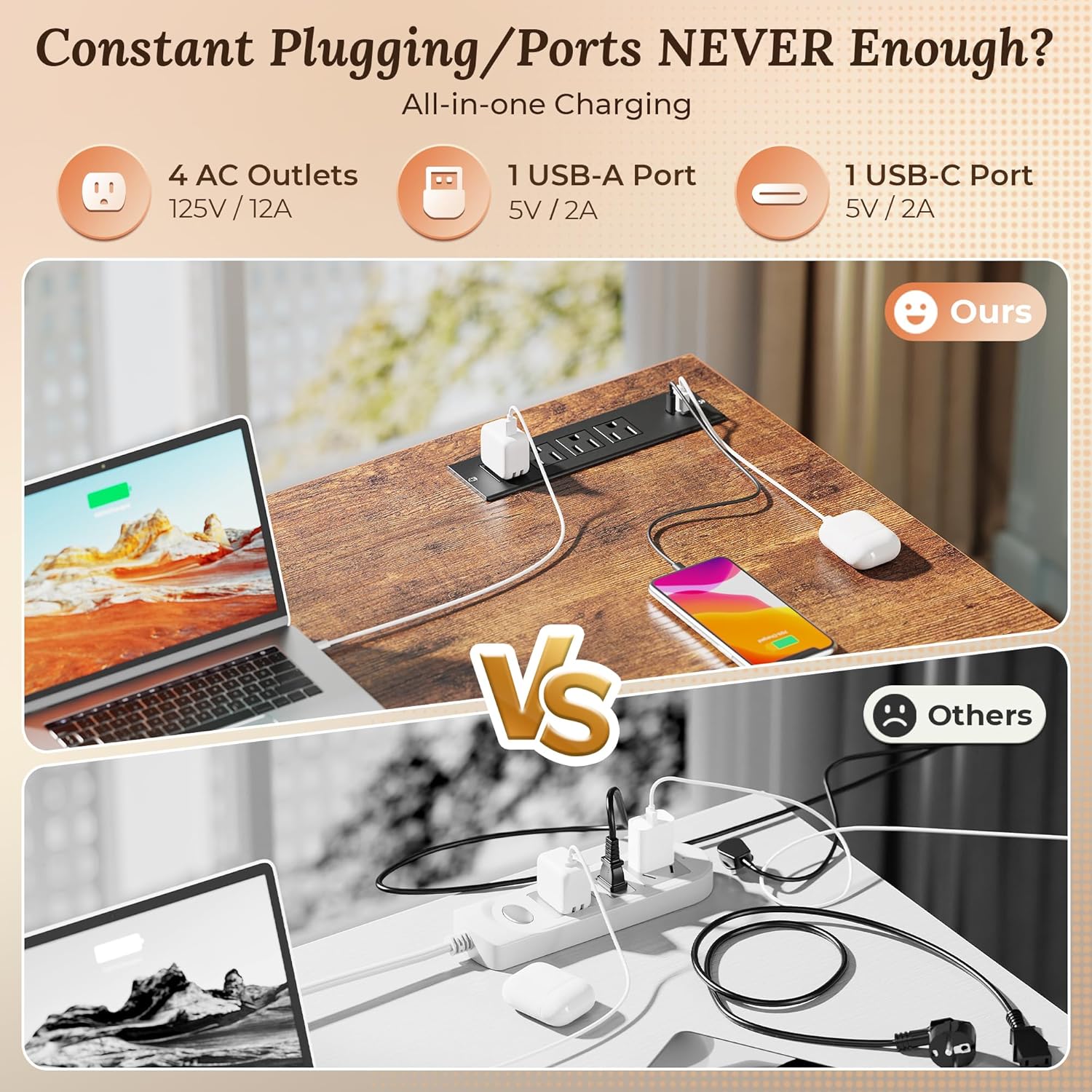 - 【Home Office Desk with Charging Station】No more crawling under the desk for plugs. This PC desk for home office includes 4 AC outlets, 1 USB-A port, and 1 USB-C port, perfect for powering everything from your laptop and monitor to your phone, tablet, or desk lamp. Charge everything without leaving your seat with this study desk