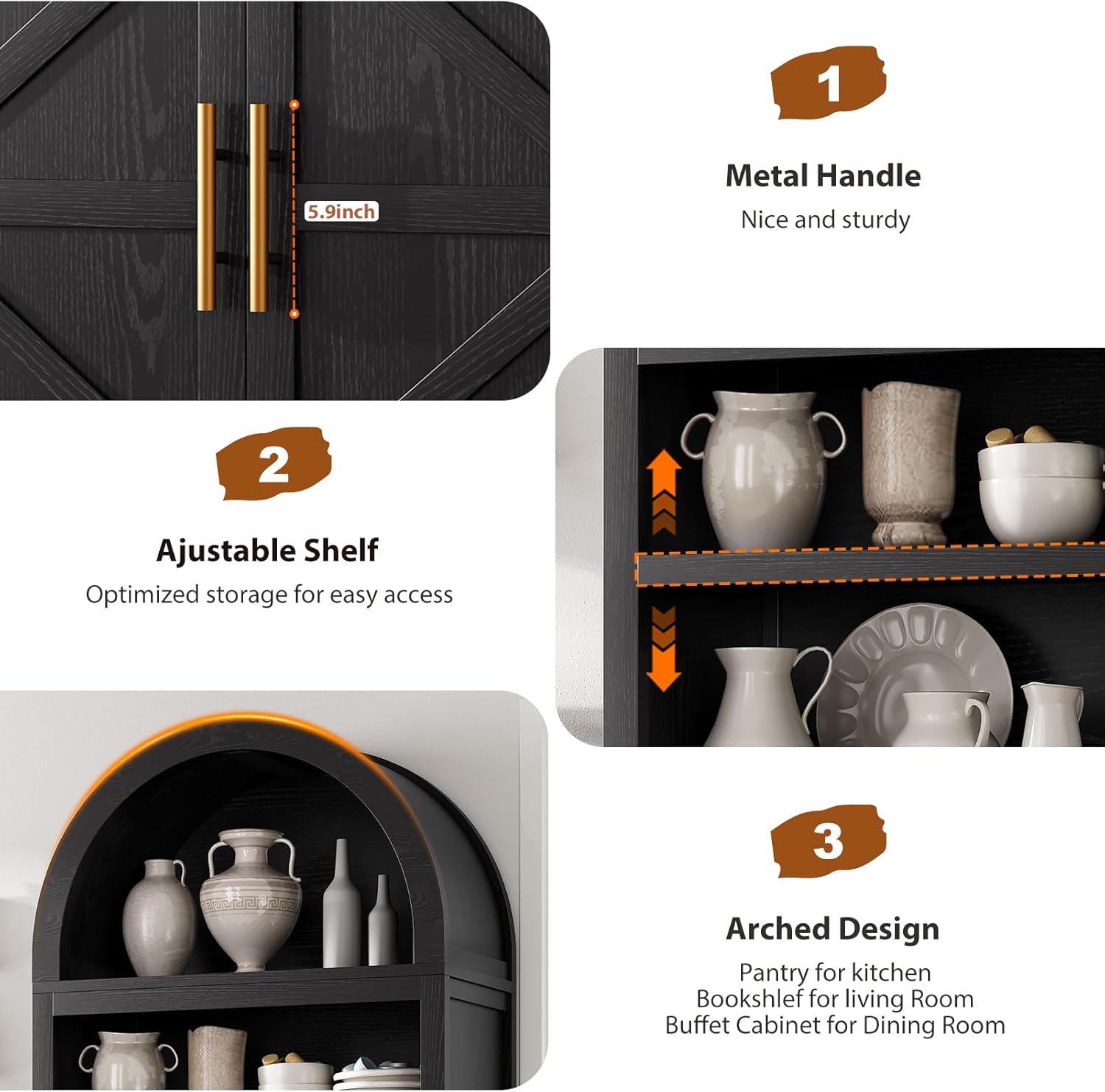 - MULTI-PURPOSE STORAGE/DECOR:As pantry cabinet,or kitchen cabinet, china cabinet, or arched bookshelf—use it as a pantry in the kitchen, a display shelf in the living room, or a stylish organizer in the home office. The storage cabinet with doors and shelves offer easy access while protecting items from dust. With its elegant arch and premium materials, it’s the perfect blend of style and practicality for any home.