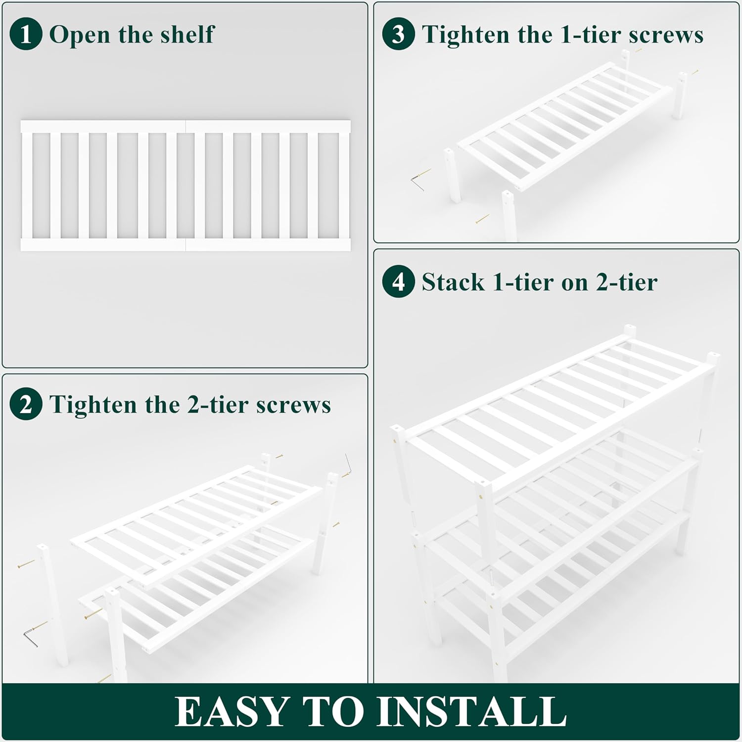 - [Stackable & Expandable] The racks can be used separately or stacked together for more storage. Combine 1-tier + 2-tier for 3 tiers, or 2-tier + 2-tier for 4 tiers. Easily expand and customize the configuration to fit your space and needs