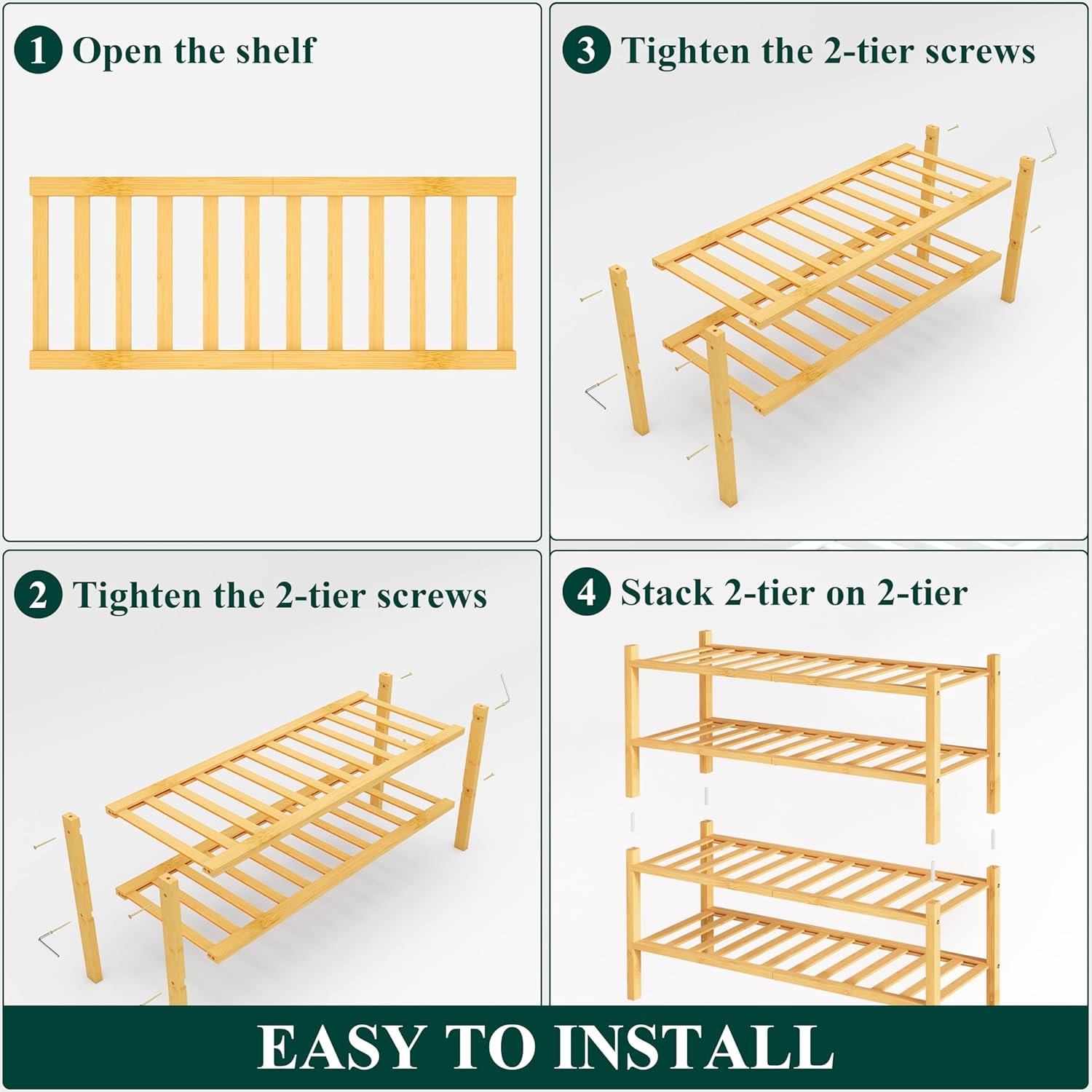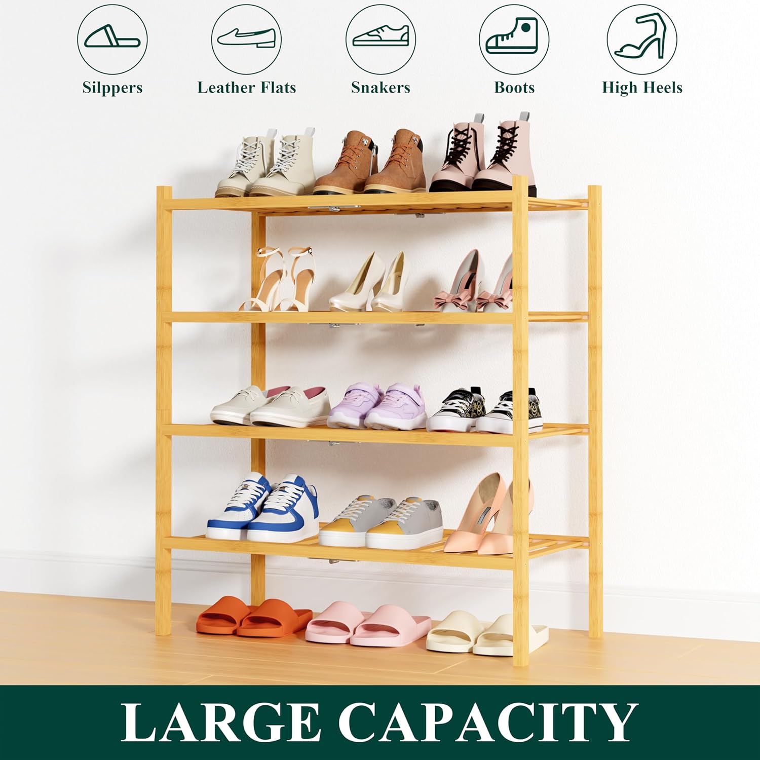 Smiry Shoe Rack, 4 Tier Thick Bamboo Shoe Organizer, Stackable Free Standing Wooden Shoe Storage Shelf for Closet, Entryway, Front Door Entrance, Natural