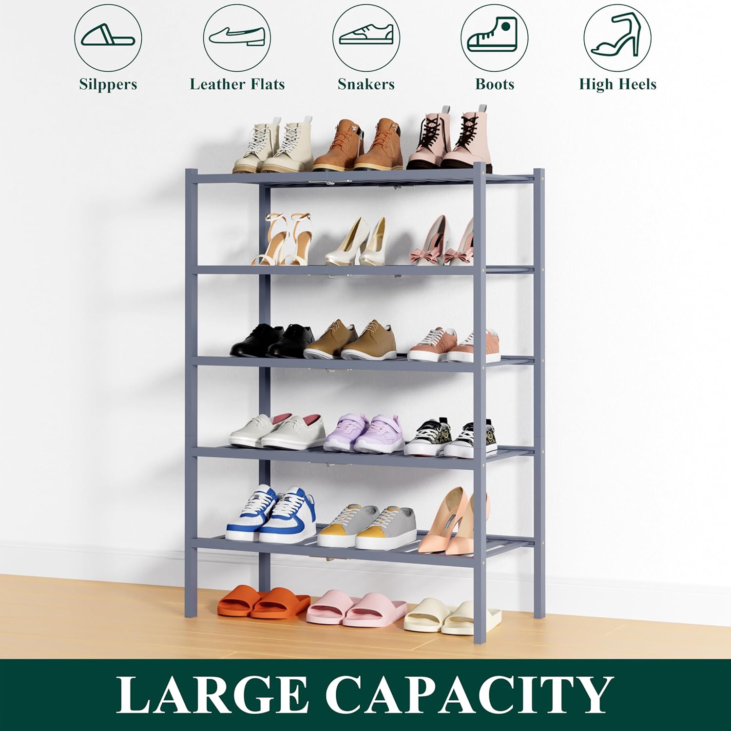 Smiry Shoe Rack, 5 Tier Thick Bamboo Shoe Organizer, Stackable Free Standing Wooden Shoe Storage Shelf for Closet, Entryway, Front Door Entrance, Grey