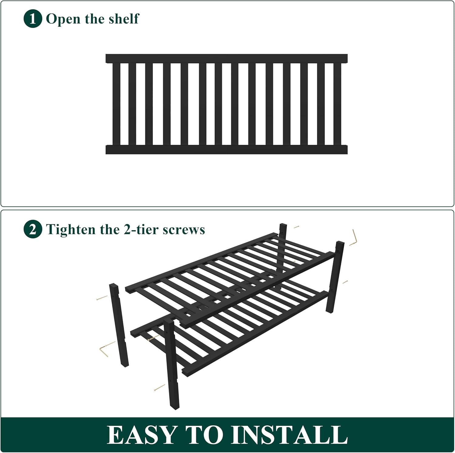 - [Stackable & Expandable] The racks can be used separately or stacked together for more storage. Combine 1-tier + 2-tier for 3 tiers, or 2-tier + 2-tier for 4 tiers. Easily expand and customize the configuration to fit your space and needs