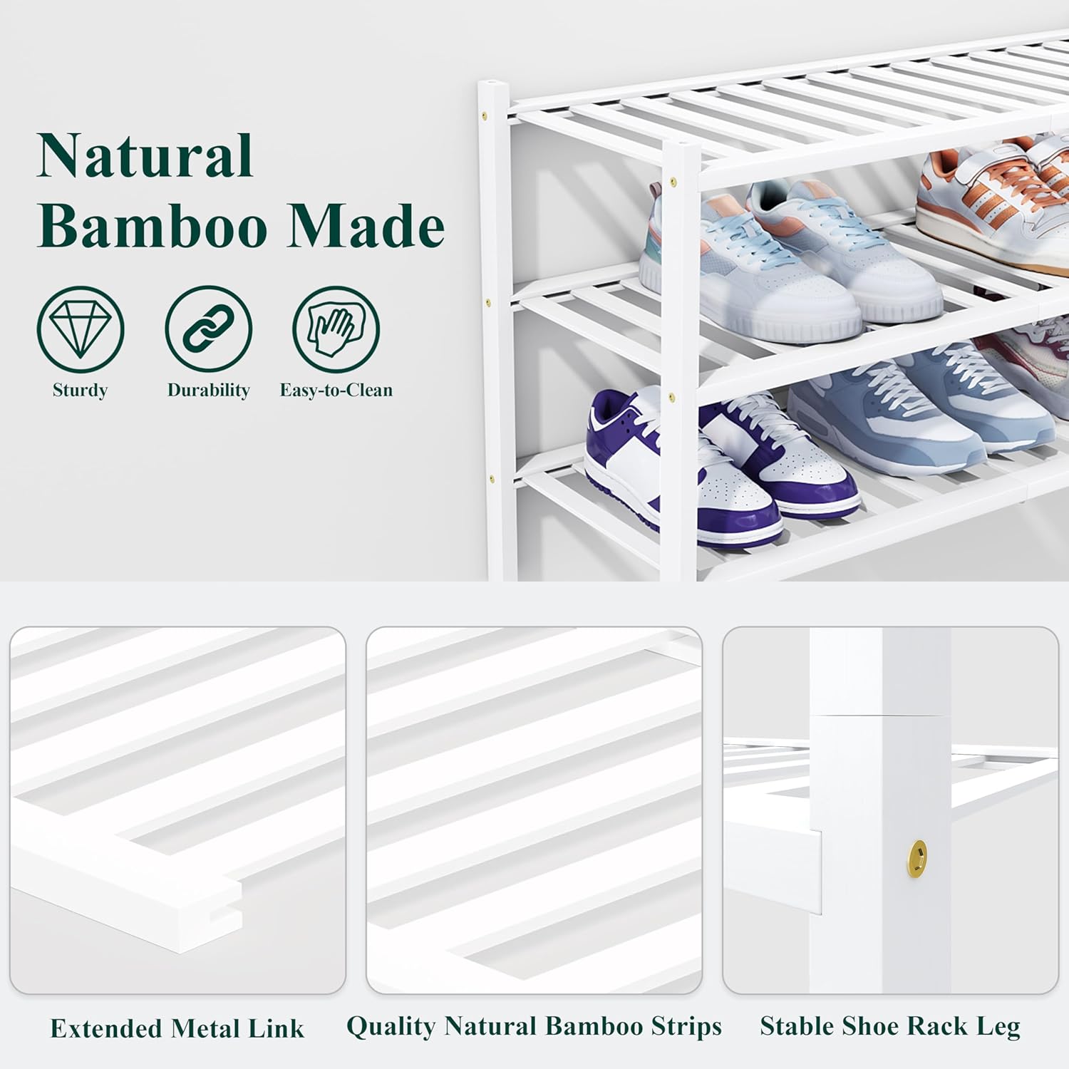 Smiry Shoe Rack, 4 Tier Thick Bamboo Shoe Organizer, Stackable Free Standing Wooden Shoe Storage Shelf for Closet, Entryway, Front Door Entrance, White