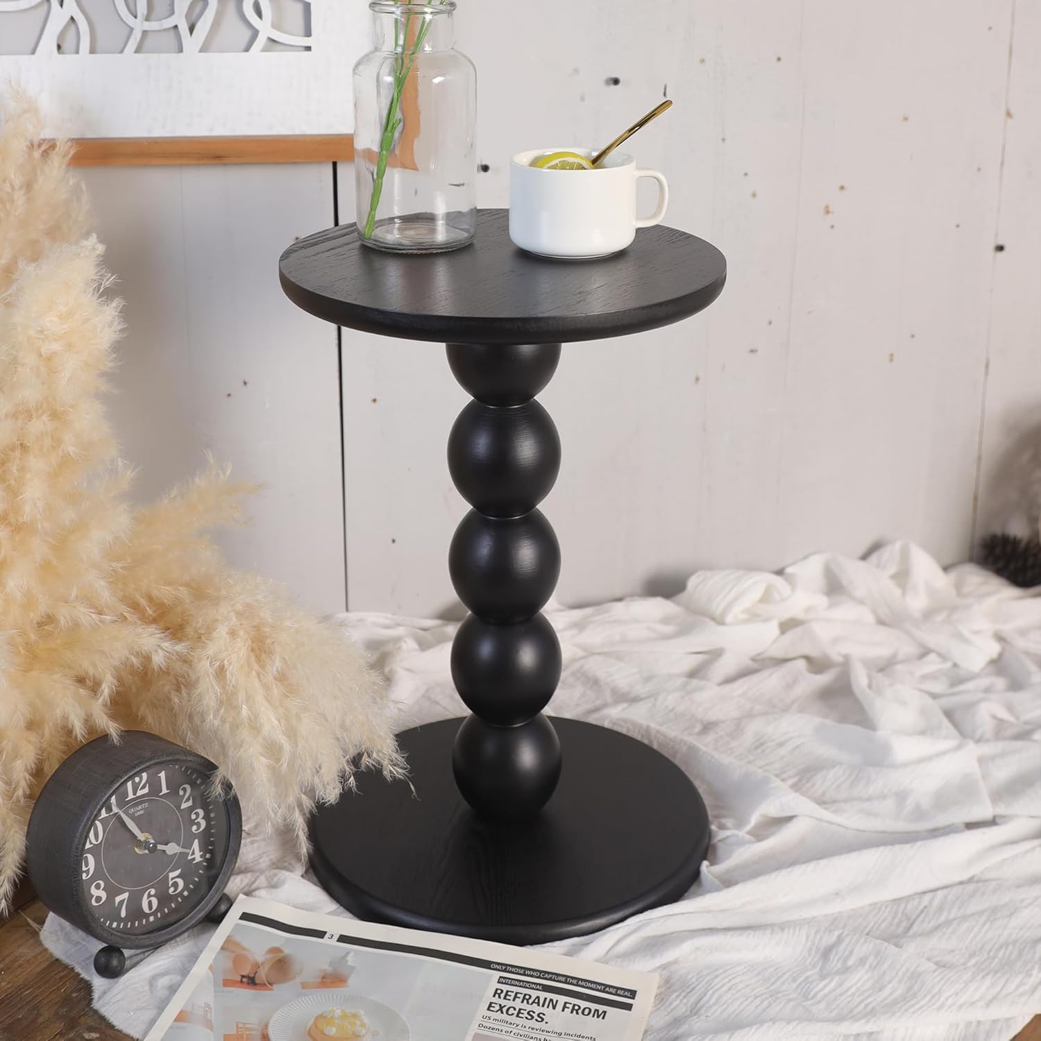 Round Wooden Side Table with Stacked Ball Pedestal Base, Accent Nightstand for Living Room, Bedroom, Corners (Black)