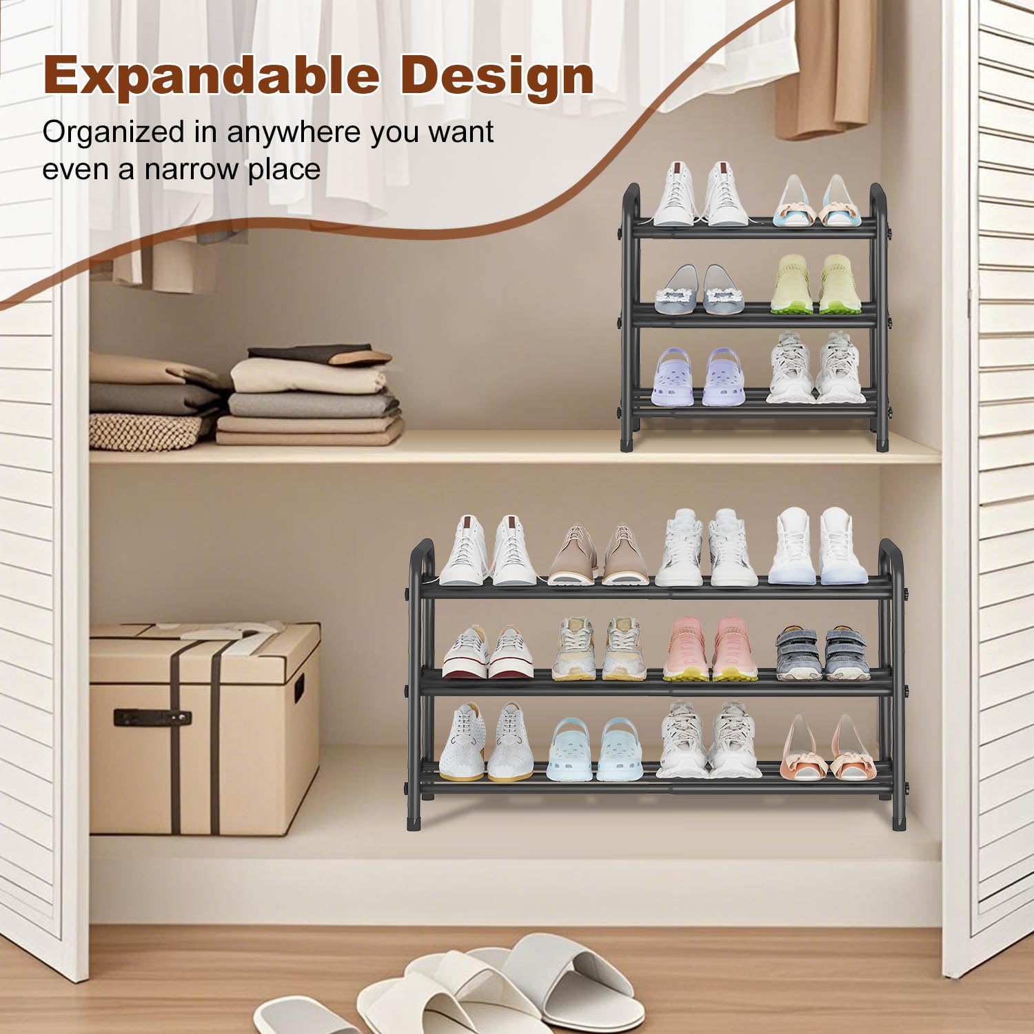 - Expandable & Adjustable Design – This 3-tier expandable shoe rack easily adjusts to fit different spaces, making it perfect for closets, entryways, and front door entrances. Use it as a small shoe rack or extend it for more shoe storage.