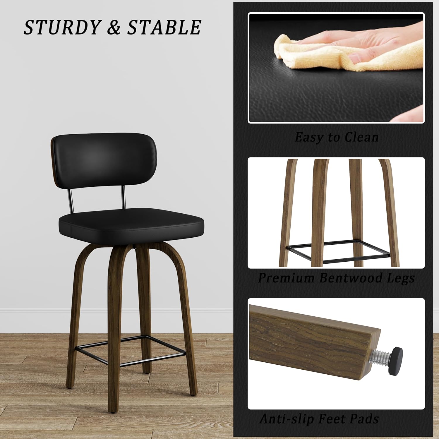 Swivel Counter Height Bar Stools with Back Set of 2, 26" Faux Leather Kitchen Bar Stools with Wood Legs and Metal Footrest for Kitchen Island (Black PU)