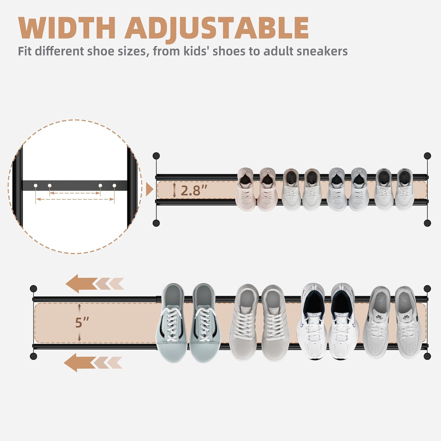 - Flexible Bar Width - The horizontal bars are not only expandable in length but also adjustable in spacing, making them ideal for storing small-size shoes like kids' sneakers or flats without slipping through. A truly adjustable shoe rack for all shoe types.