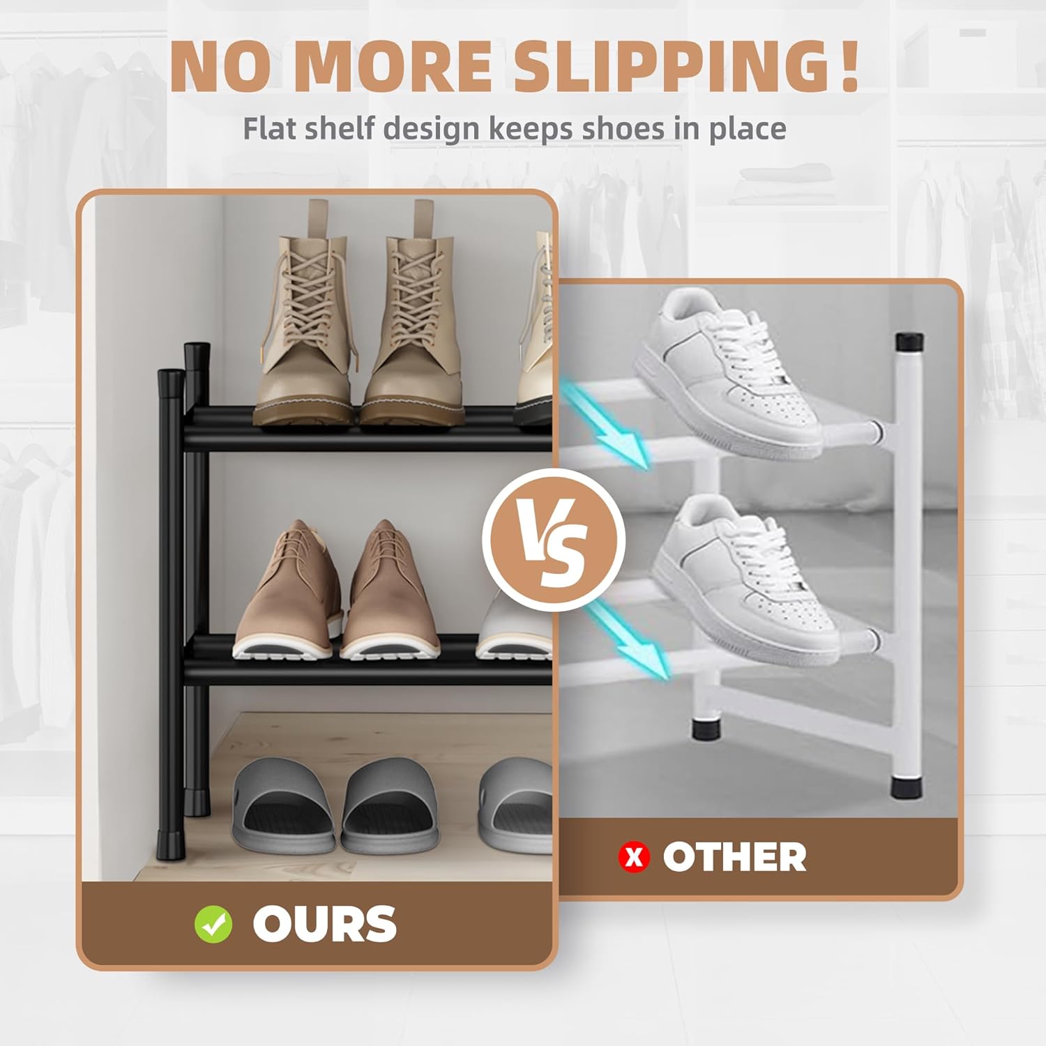 - Sturdy & Slip-Free Design - Flat bar shelves keep shoes from slipping off. Anti-tip structure and non-slip feet provide extra stability on tile, wood, or carpeted floors. A smart choice for any shoe rack for closet, entryway, or garage use.