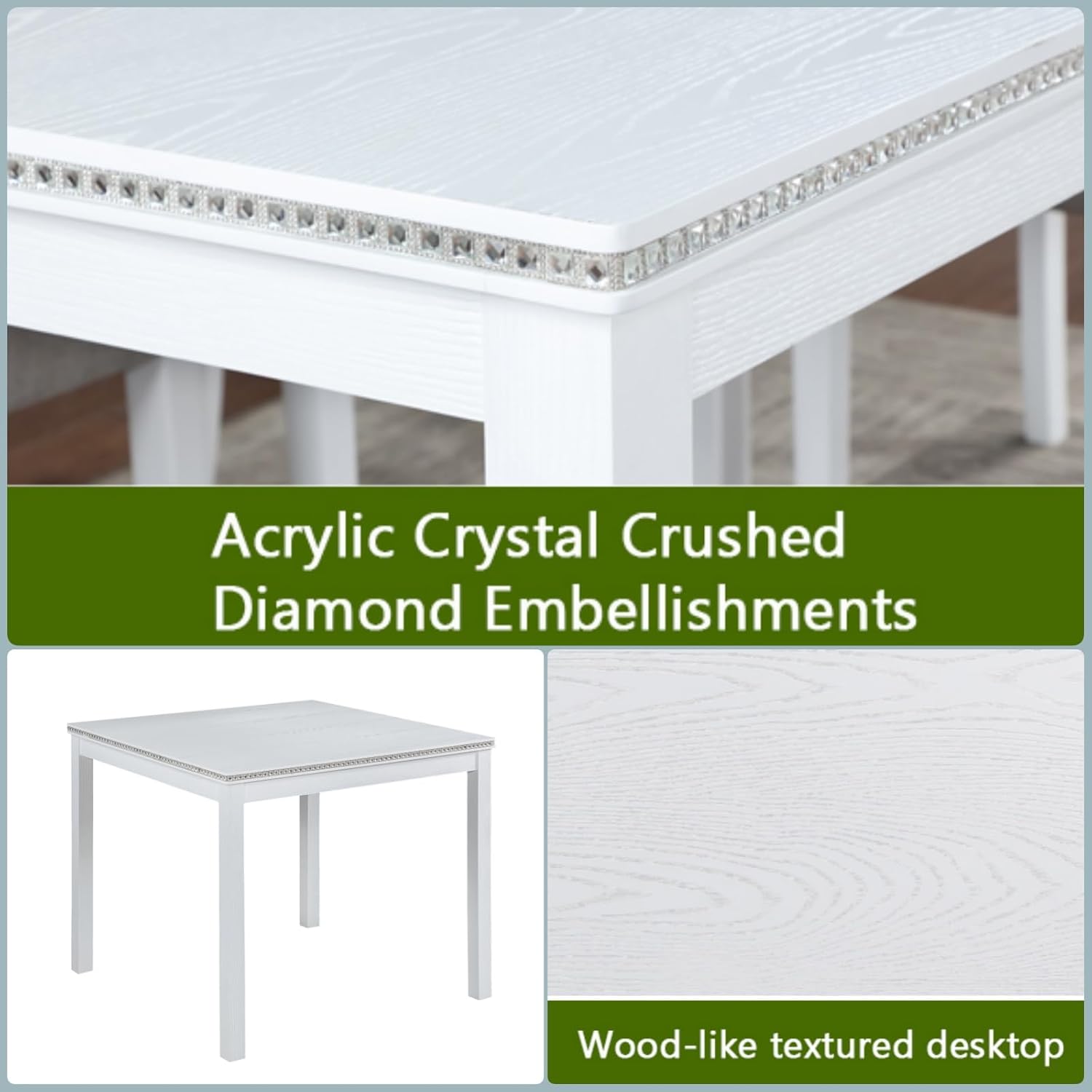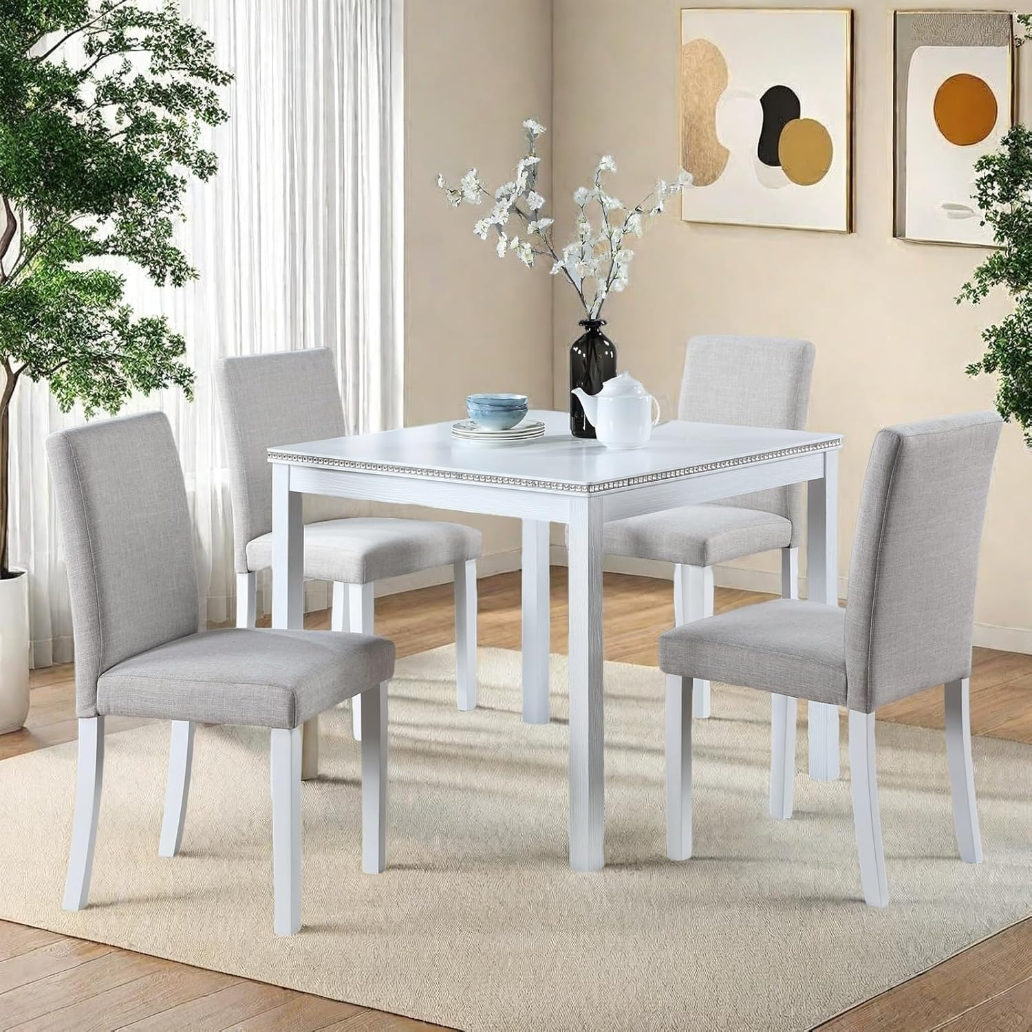 Dining Table Set for 4, 5-Piece Kitchen Table & Chairs Set with Versatile Square Table & 4 Upholstered Chairs, 34.5'' Dinner Set with Crystal Decorations & Wood Grain Design, Light White