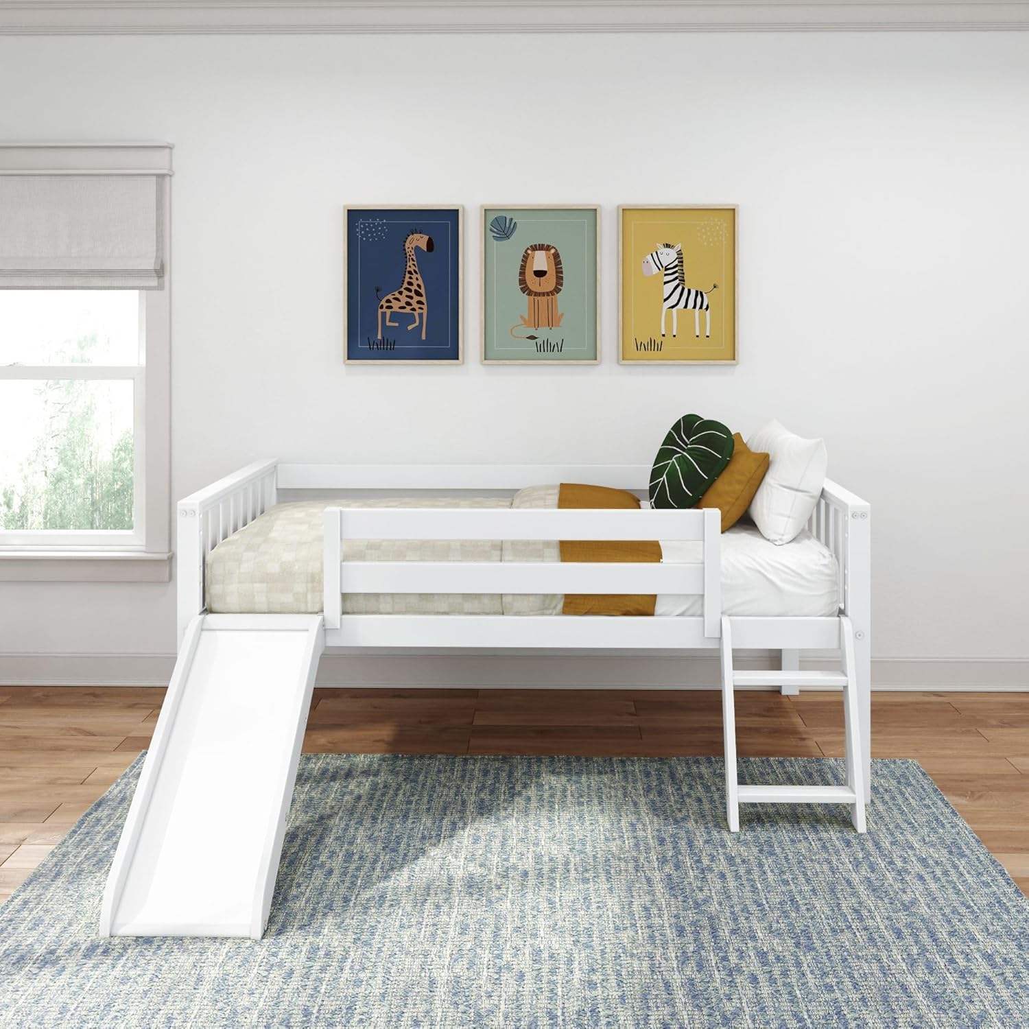- Safety First: Ladder securely attaches to twin-size low loft bed for easy and stable climbing; Low-profile design makes this bed the perfect big-kid bed for ages 3 and up; Tall 14.5” guardrails pair safely with mattresses less than 9” thick.