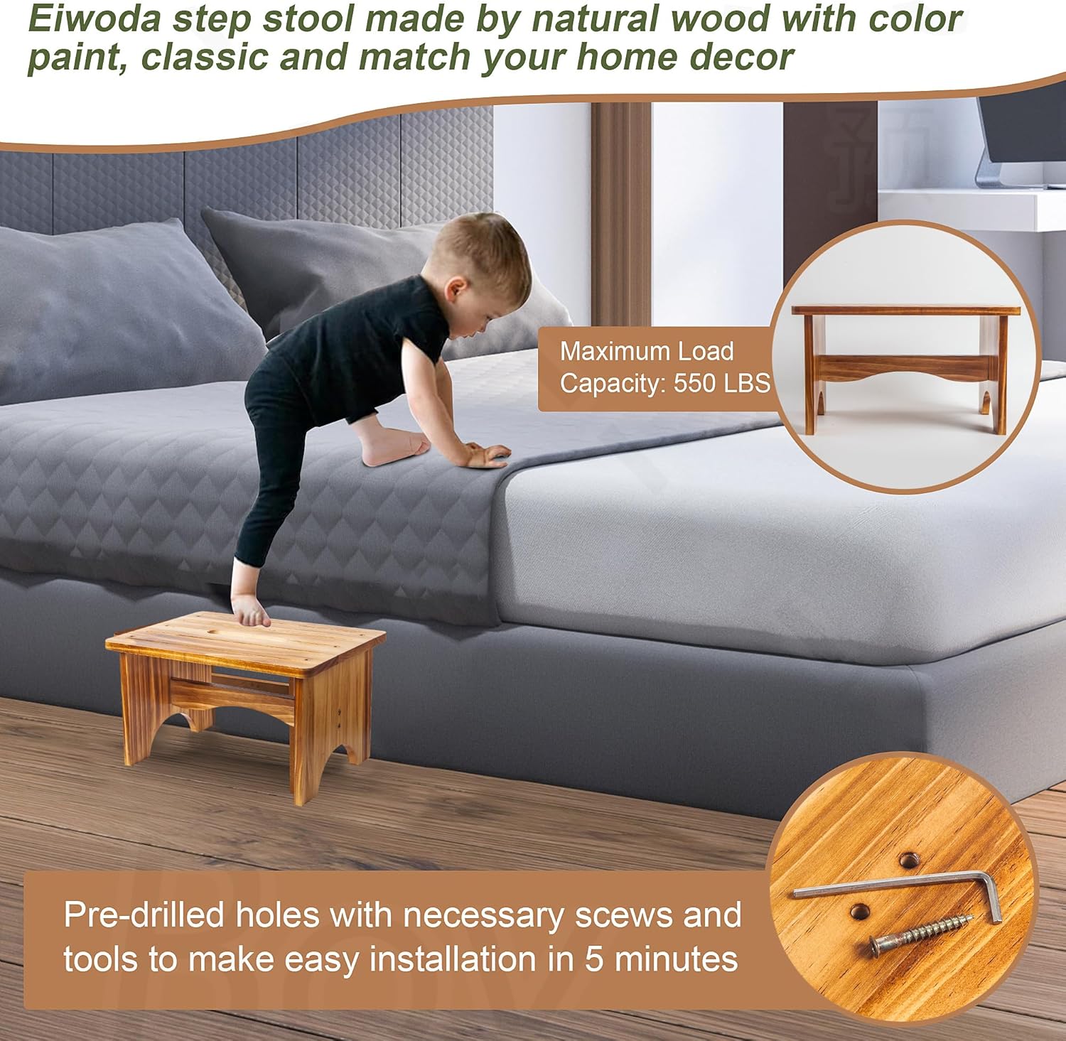 - ❤️【STURDY & DURABLE STRUCTION】Our toddler wood step stool for adults and kids with thick wood and reinforced structure that can withstand substantial loads up to 550 lbs. Non-slip pads under each leg provide a secure grip on floors without slip or slide and prevent your floor surface from scratches.
