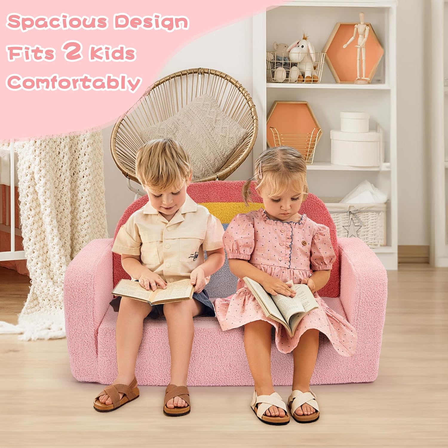 Extra Wide Kids Couch, 2-in-1 Soft Toddler Couch with Blanket, Comfy Toddler Chair, Convertible Sofa to Lounger with Cute Colorful Rainbow Design, Pink