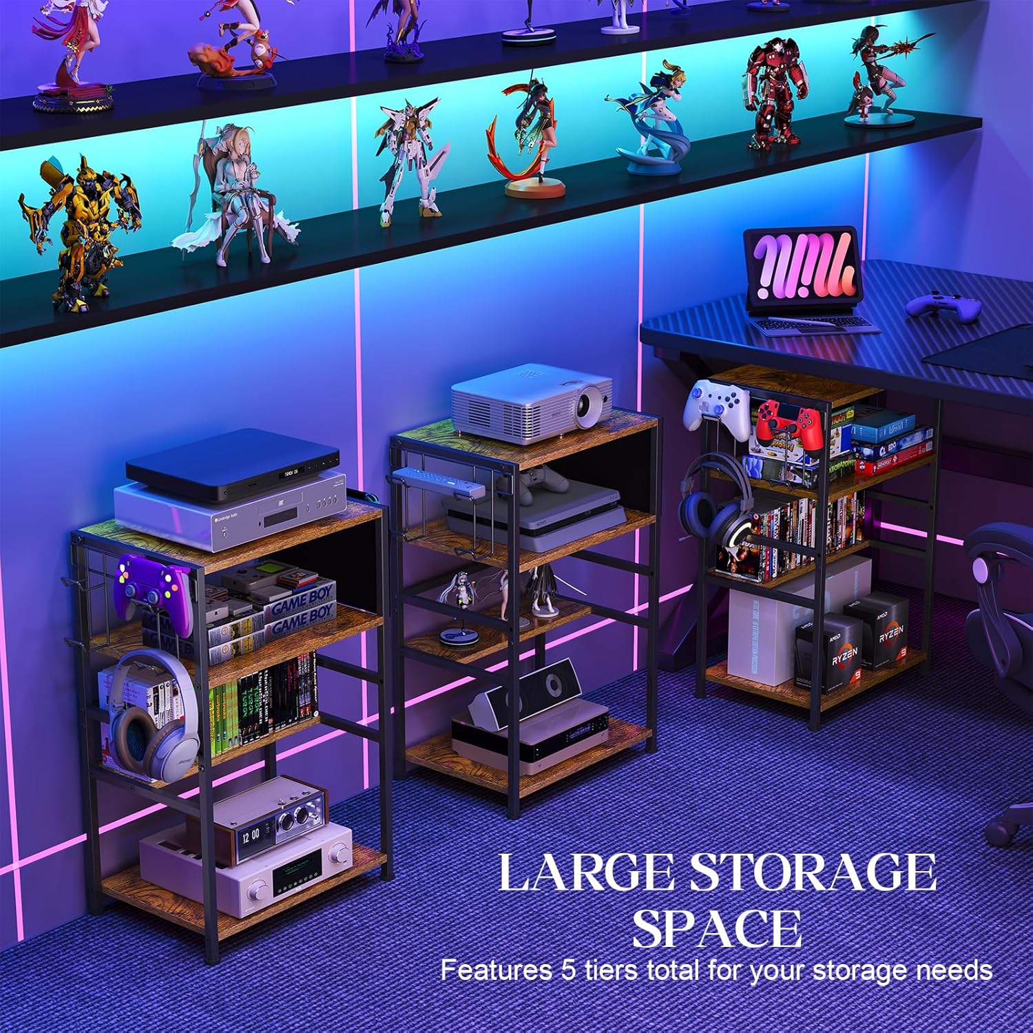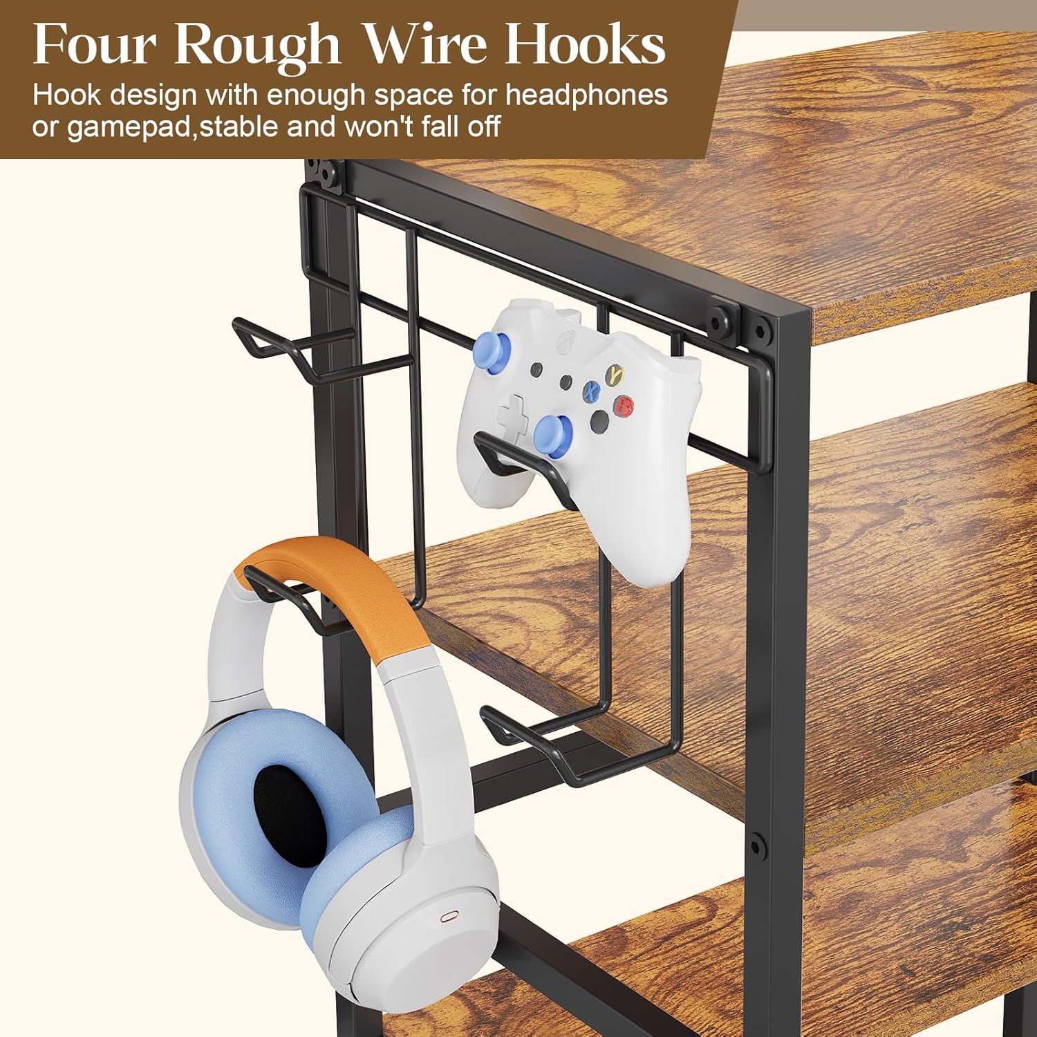 - 【Versatile Hook System】The dvd shelf comes with 4 heavy-duty anti-rust metal hooks, each supporting up to 6.6 lbs. Perfect for securely hanging headphones, game controllers, and VR equipment. The strategically placed hooks maximize vertical space, keeping your desktop tidy while ensuring quick access to frequently used gear.