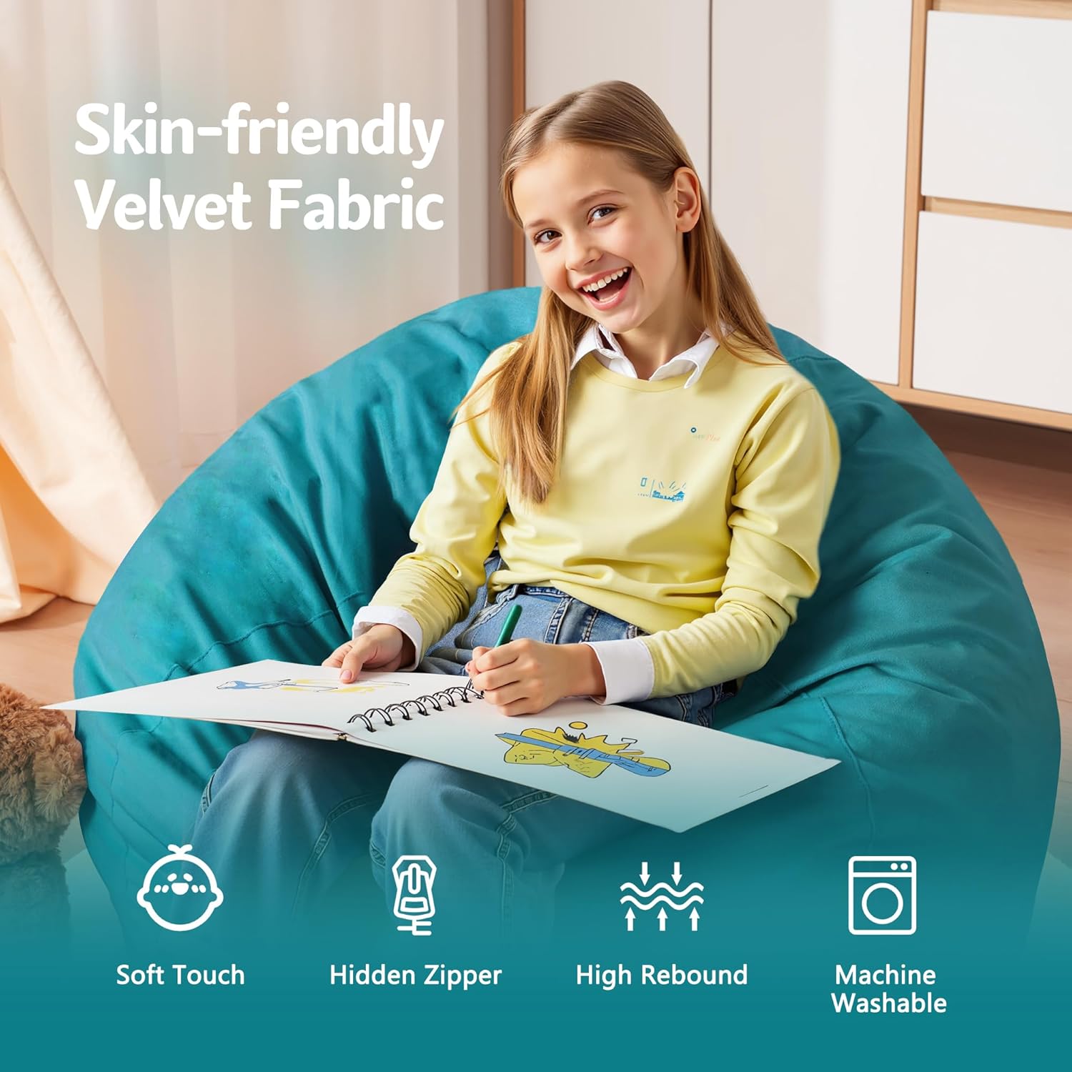 - Removable and Washable Cover: The cover of bean bag chair is removable and washable for further care. It is made of breathable premium dutch velvet with fine texture, soft and skin-friendly from touching. It is also anti-pilling and not easy to fade. You can easily put the beanbag cover into washer to clean it like new. Moreover its double stitched seams and hidden double-pull zipper ensures for super durability & strength.