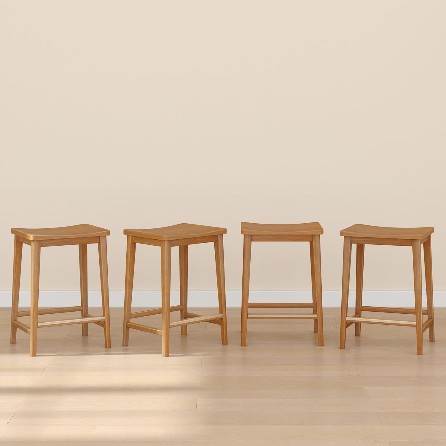 Plank+Beam Smythe Counter Stool, 24", Set of 4, Sturdy Wood Modern Kitchen Counter Height Stool, Saddle Seat Backless Counter Chair, Metal Footrest, Pecan