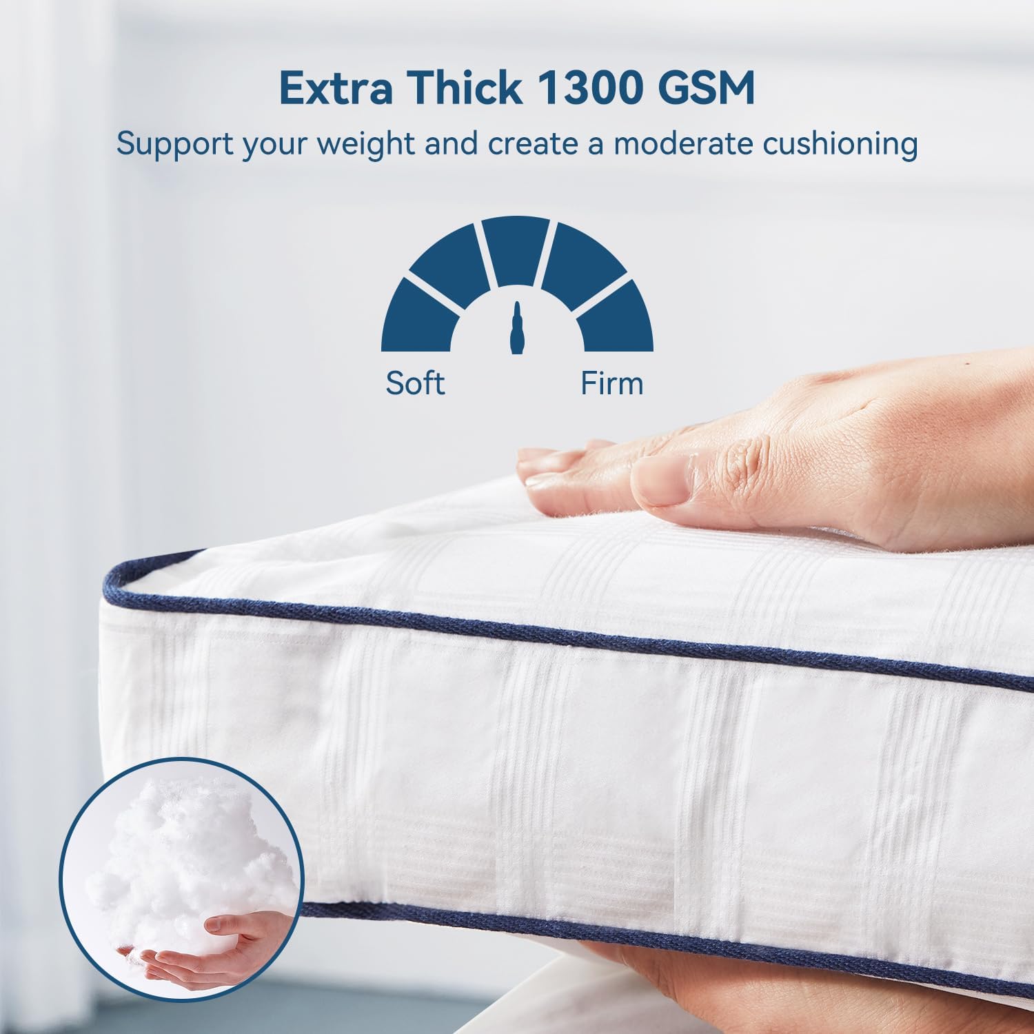 - 【Breathable&Ultra Thick】Made with 100% cotton, the soft, airy surface enhances airflow for a cooler sleep. The elegant 500TC jacquard cotton offers durability and luxury. Overfilled with 1300gsm down alternative, this plush topper provides superior support, relieving fatigue for deeper, more restful sleep.