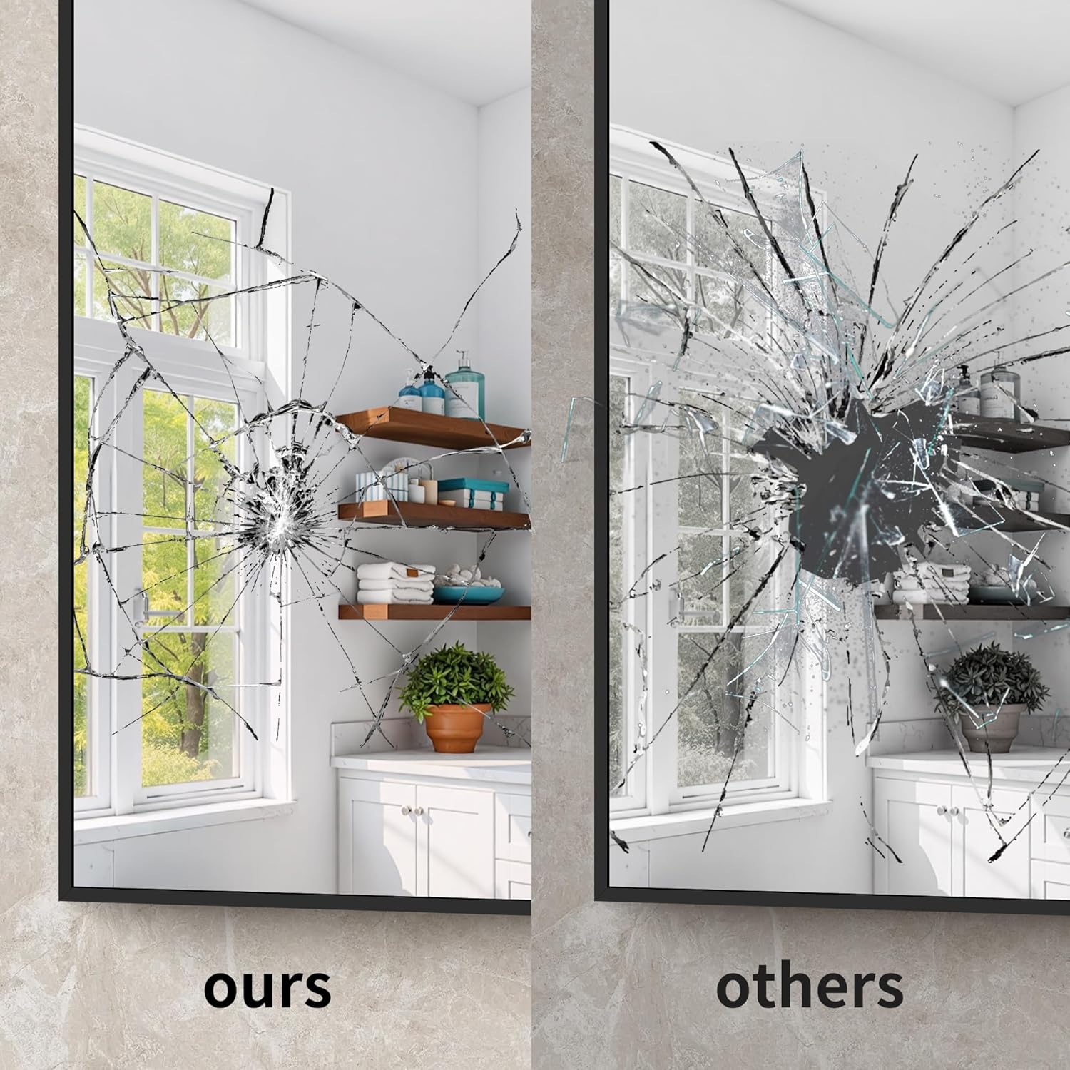 - Certified Safety: The bathroom mirror is equipped with 3 mm thick tempered glass and a double-layer shatterproof film. In the event of accidental breakage, the glass adheres tightly to the shatterproof film and does not splash—Ideal for households with children or pets.
