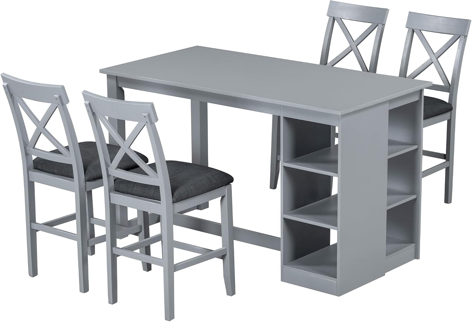 Merax 5 Piece Solid Wood Farmhouse Counter Height Dining Table Set with 3-Tier Storage Shelves,and 4 Upholstered Dining Chairs,Gray