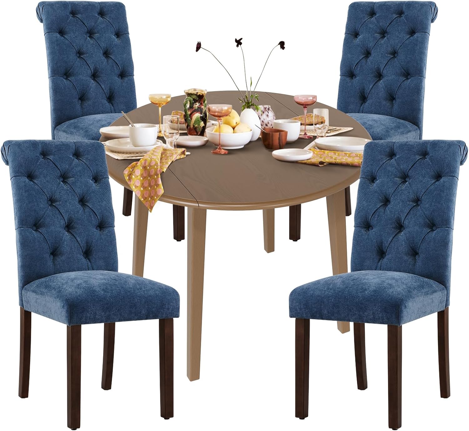 COLAMY 5-Piece Extendable Dining Table Set for 4, 36" Kitchen Round Wood Table with 4 Tufted Dining Room Chairs,Light Brown/Blue