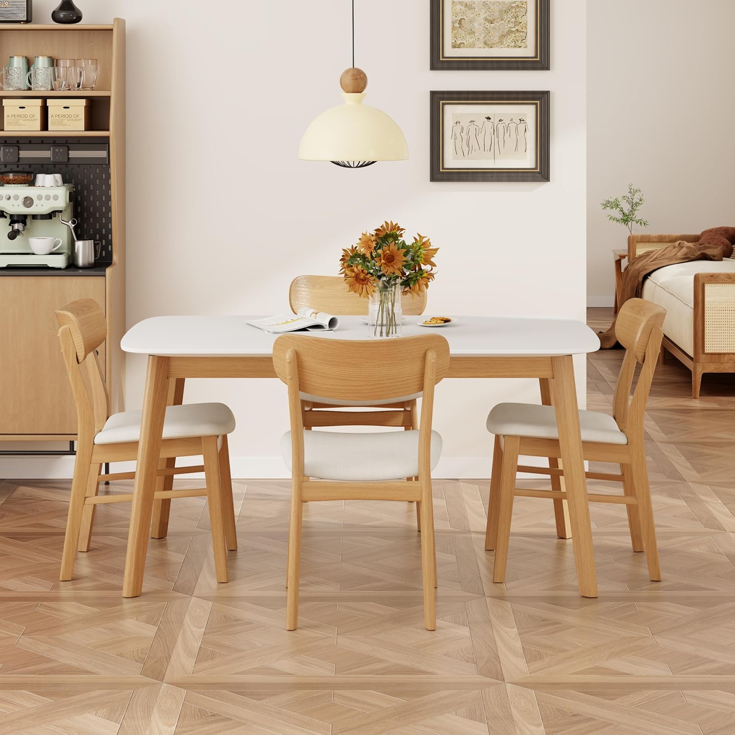 - Charming Mid-Century Modern Aesthetic—Designed in the iconic mid-century modern style, the set features a cozy color palette that radiates warmth. Its elegant yet minimalist design seamlessly fits into various interior themes—be it modern, Scandinavian, or transitional—elevating your dining space with a sophisticated, timeless charm.