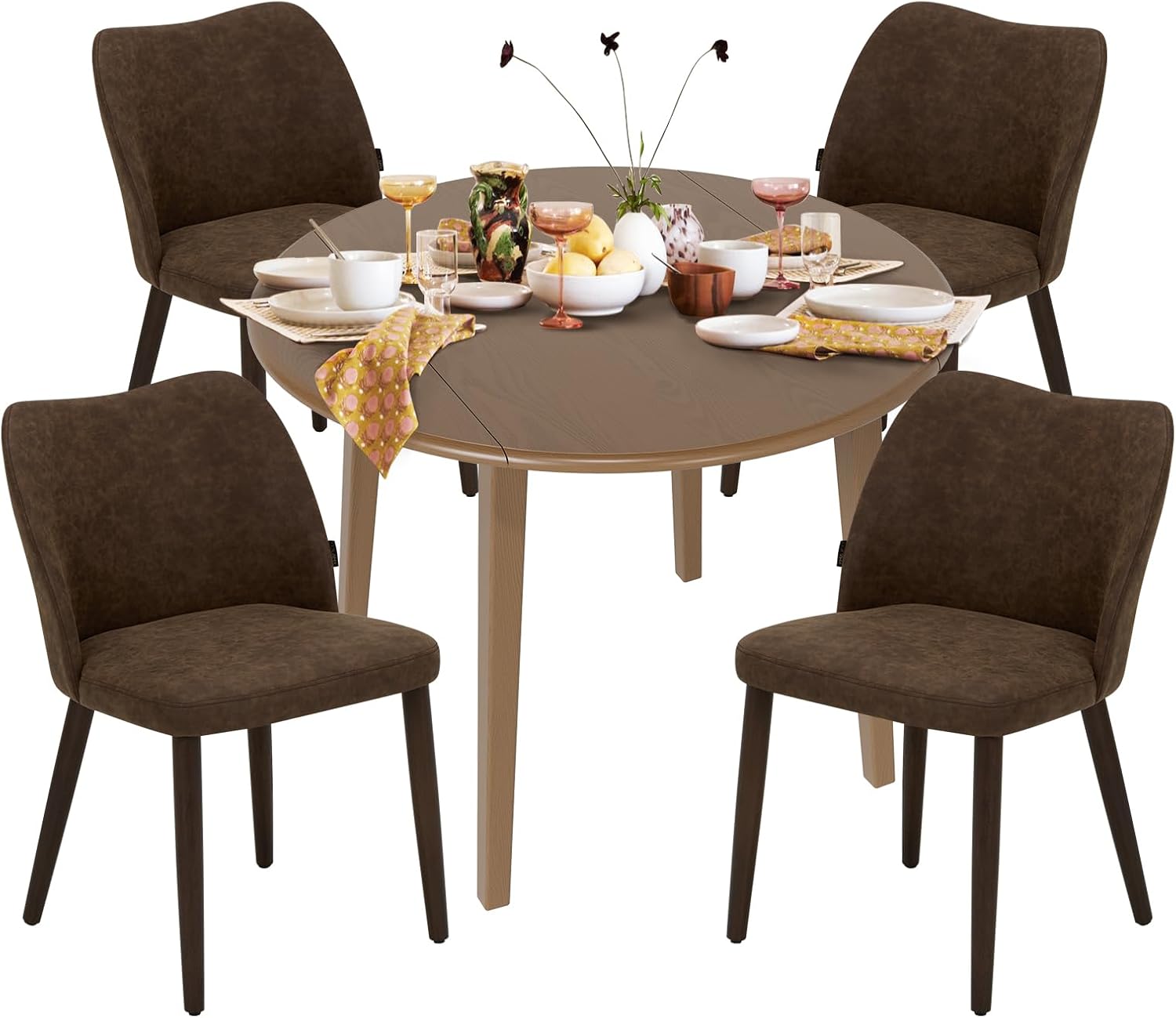 COLAMY 5-Piece Extendable Dining Table Set for 4, 36" Kitchen Round Wood Table with 4 Wooden Dining Room Chairs,Light Brown/Dark Brown