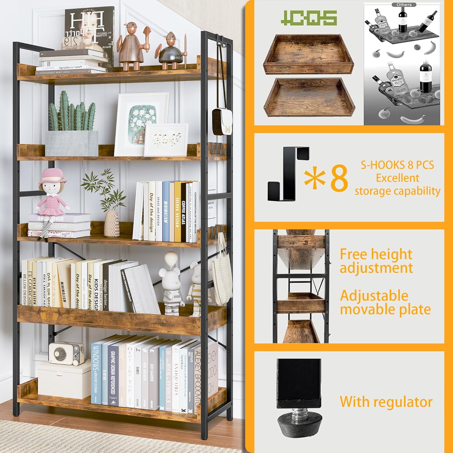 - 【8 Storage Hooks & Anti-Falling】The 5 tier bookshelf have different iron frame designs on each side, providing versatile storage options for products of various heights including books and ornaments. Additionally, 8 multipurpose hooks are included to hang headphones, toys, or other small decor.