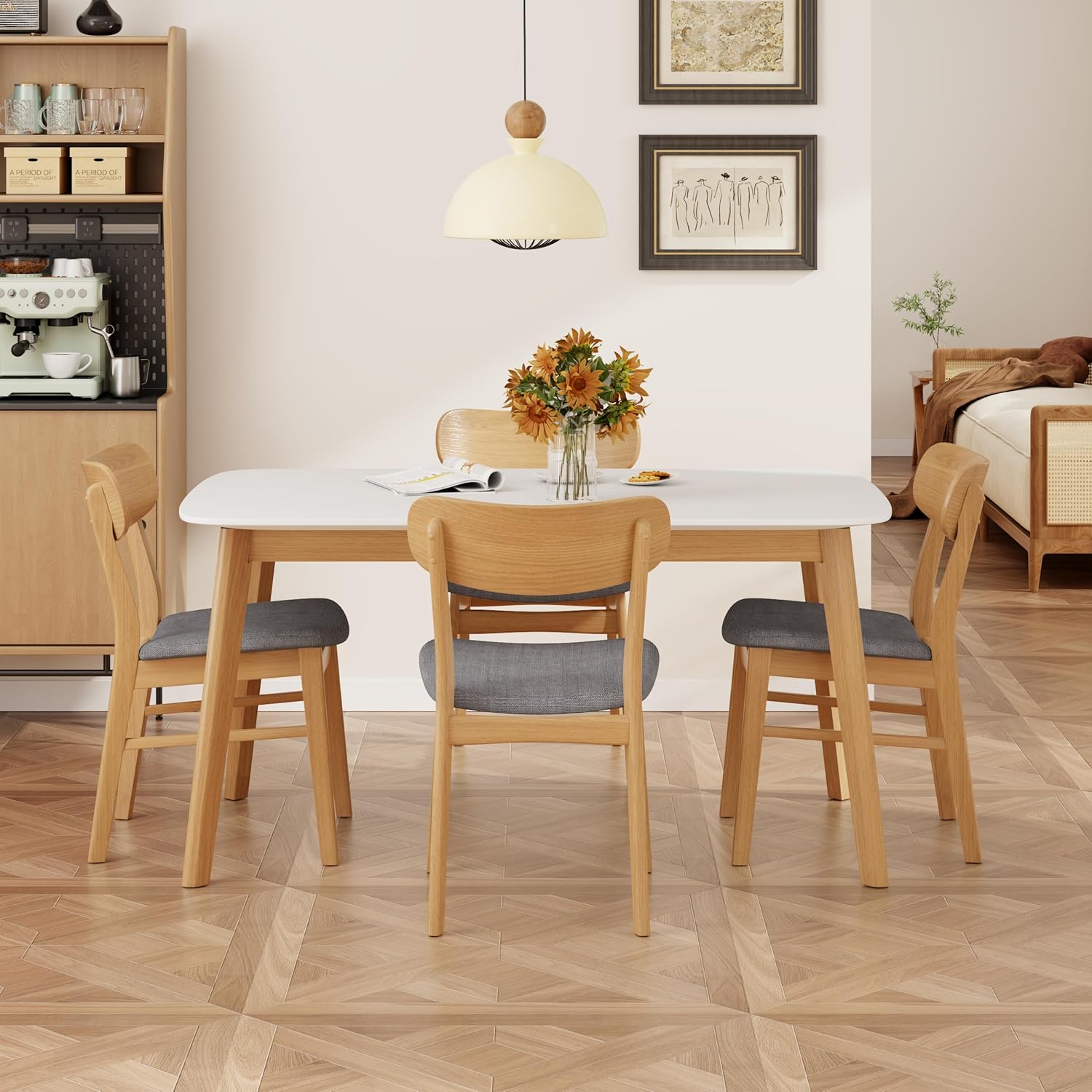 - Charming Mid-Century Modern Aesthetic—Designed in the iconic mid-century modern style, the set features a cozy color palette that radiates warmth. Its elegant yet minimalist design seamlessly fits into various interior themes—be it modern, Scandinavian, or transitional—elevating your dining space with a sophisticated, timeless charm.