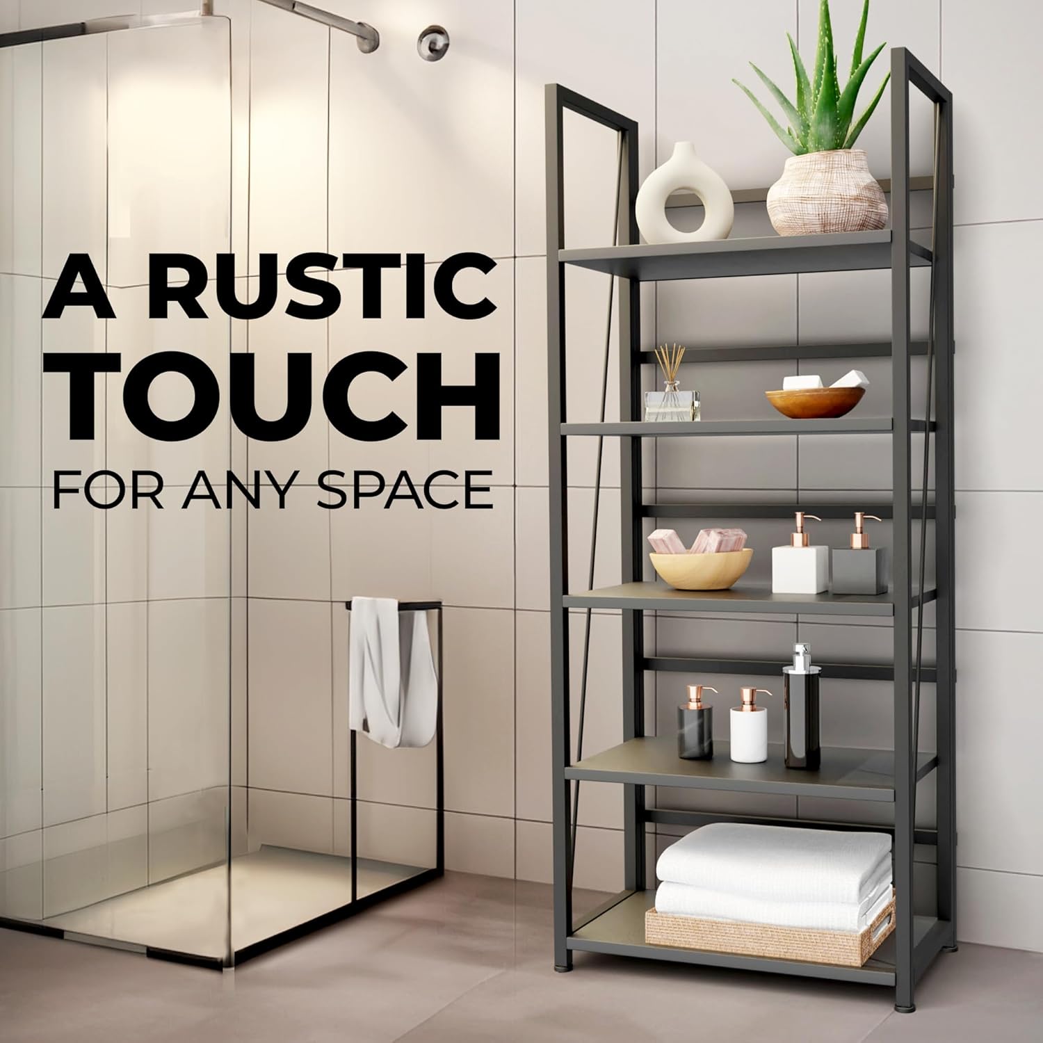 - SHOWCASE YOUR COLLECTION of books, CDs, photo frames, plants, or storage boxes flawlessly on our metal bookshelf. With 5 tier shelf, you'll never run out of space to exhibit your treasures, creating a visually stunning display in any room