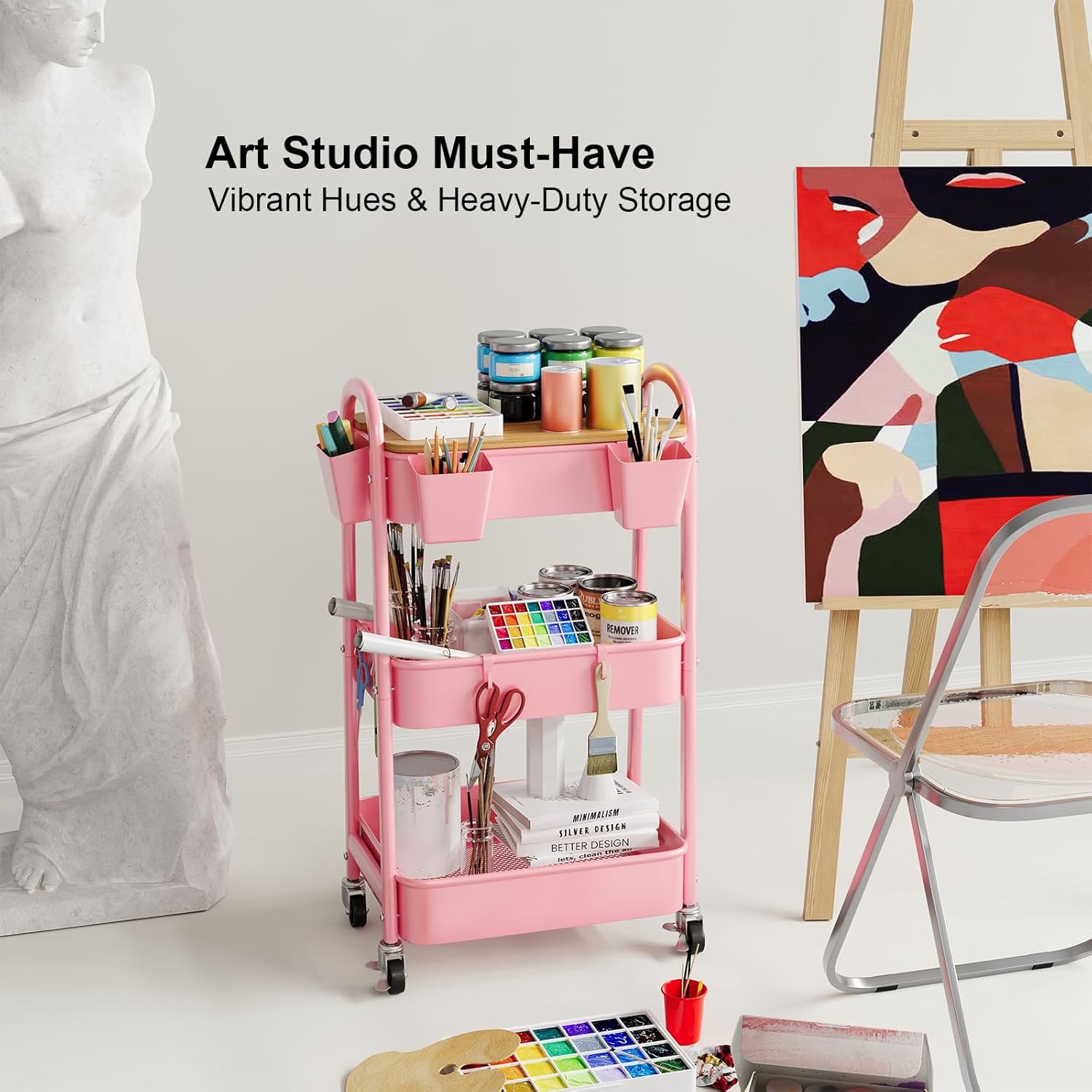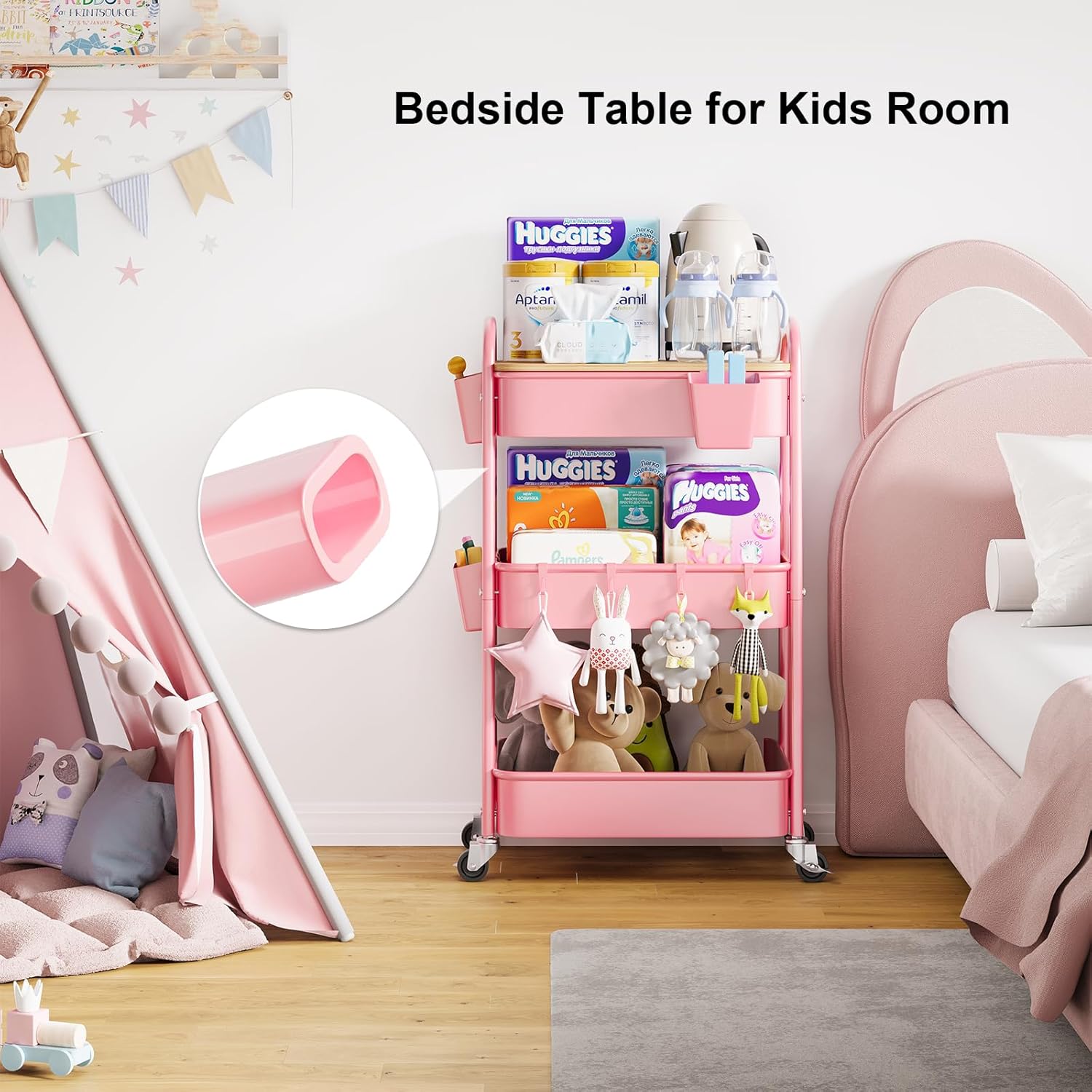3 Tier Rolling Cart Metal with Wheels & Table Top, Pink Utility Cart with Cups and Hooks, Three Tiered Craft Cart Organizer on Wheels, Storage Carts for Salon, Lash, Hair, Nail, Makeup, Diaper, Book
