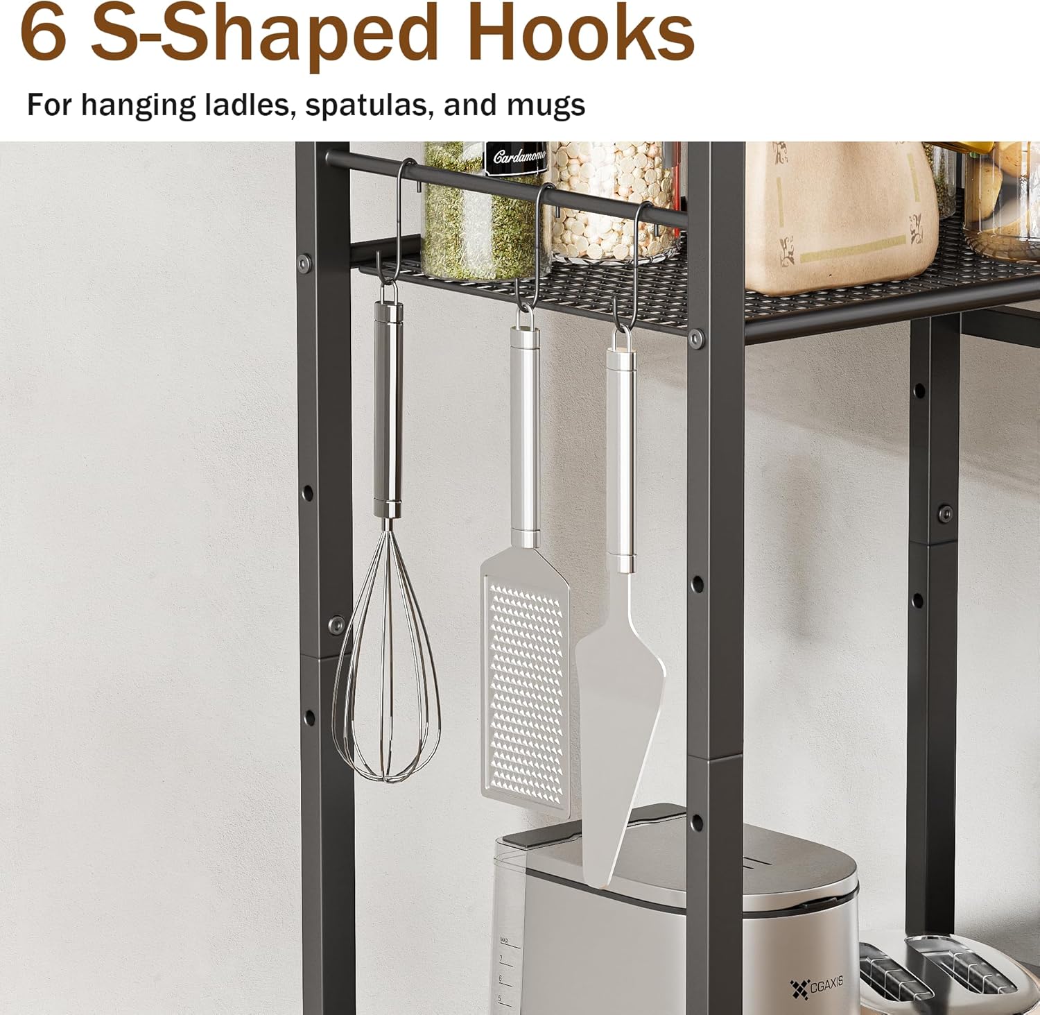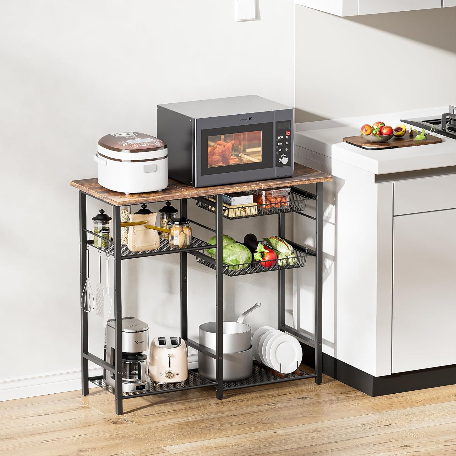 Kitchen Baker’s Rack, Microwave Stand with 2 Mesh Basket, Coffee Bar, 6 S-Shaped Hook, for Kitchen Storage Shelf, Living Room, Rustic Brown and Black