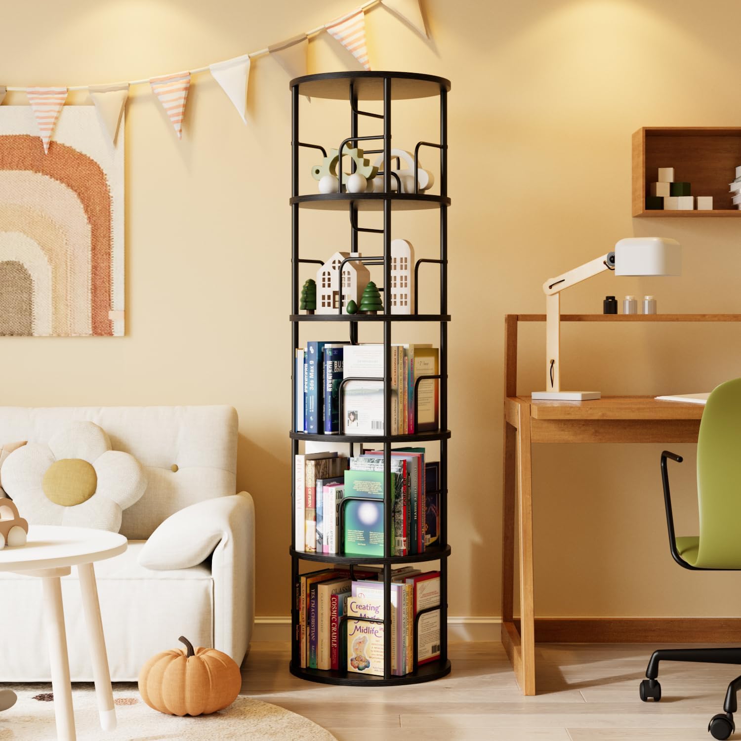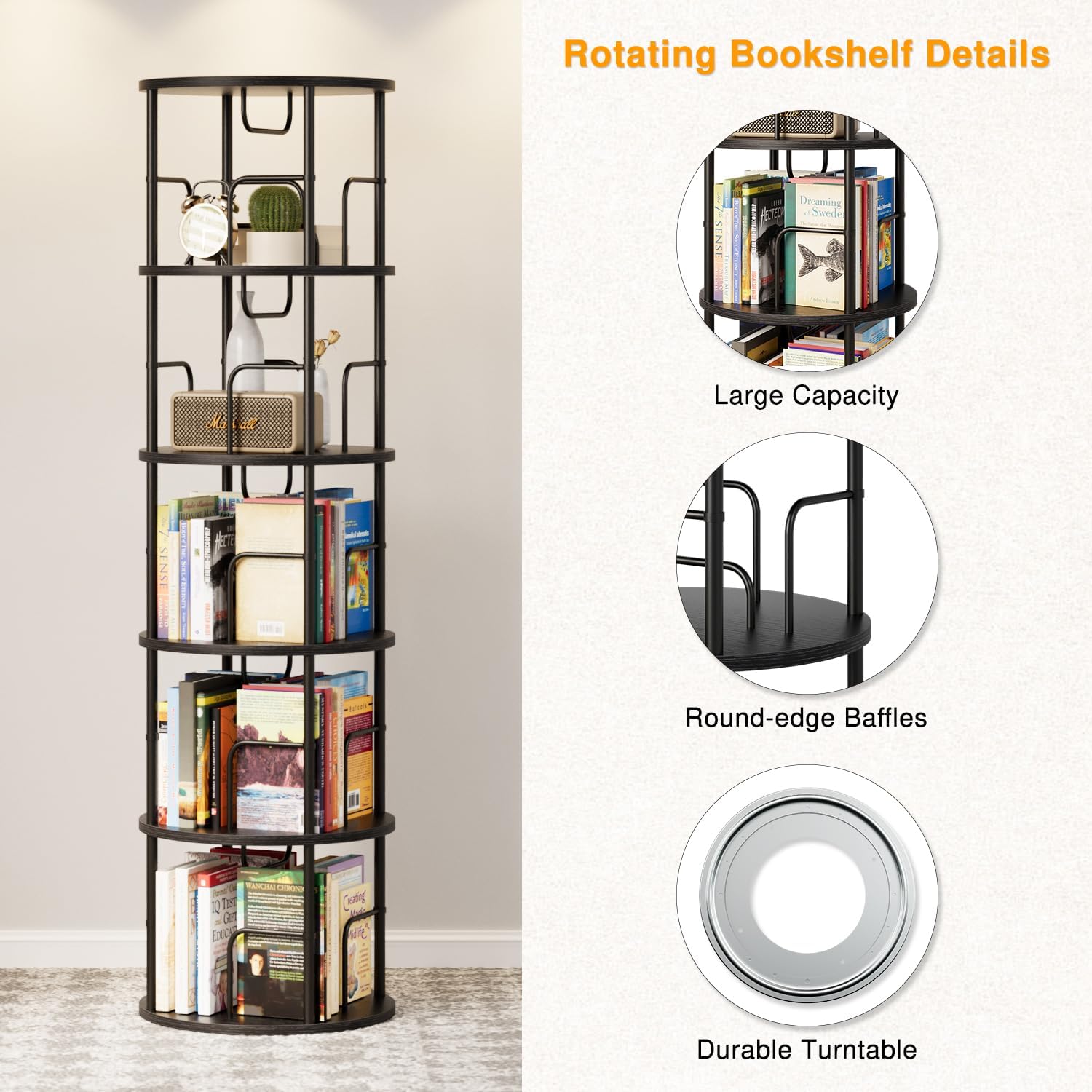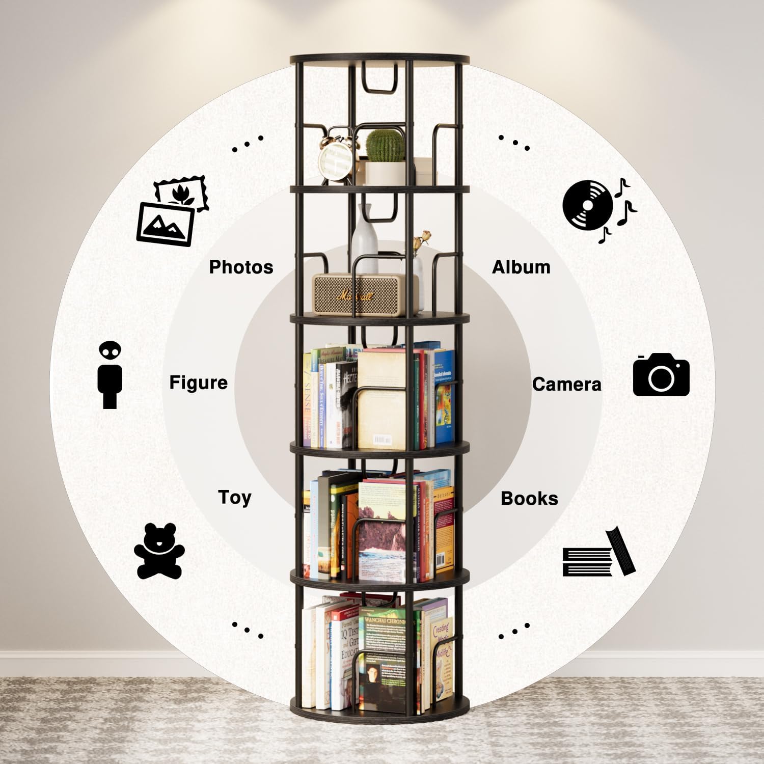 5 Tier Rotating Bookshelf, 360 Display Spinning Corner Bookshelf, Space-Saving Metal Frame Bookcase for Living Room, Office, Bedroom, Black