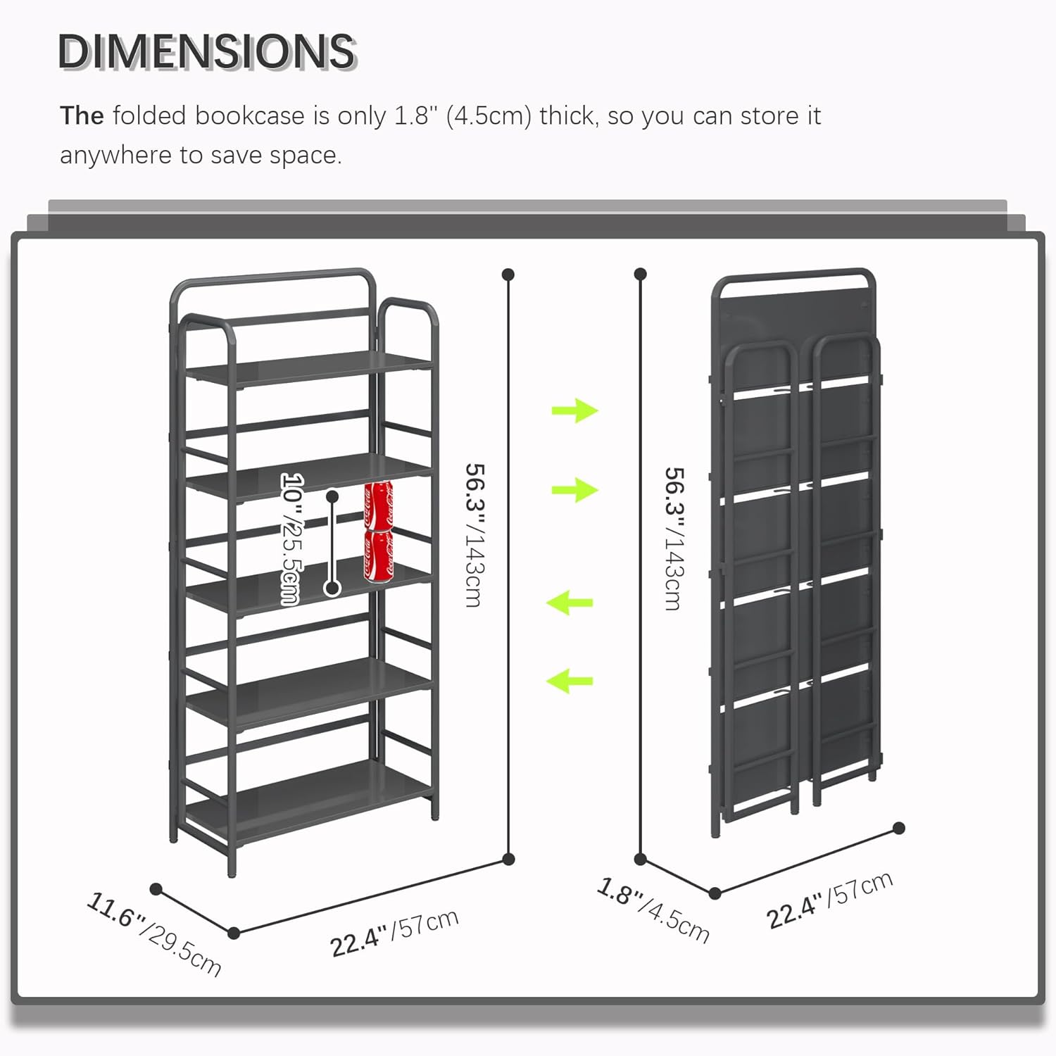 4NM No Assembly Folding Bookshelf 5 Tiers Vintage Industrial Black Book Shelf Metal Foldable Storage Bookcase and Bookshelves for Living Room,Bedroom and Kitchen - Black