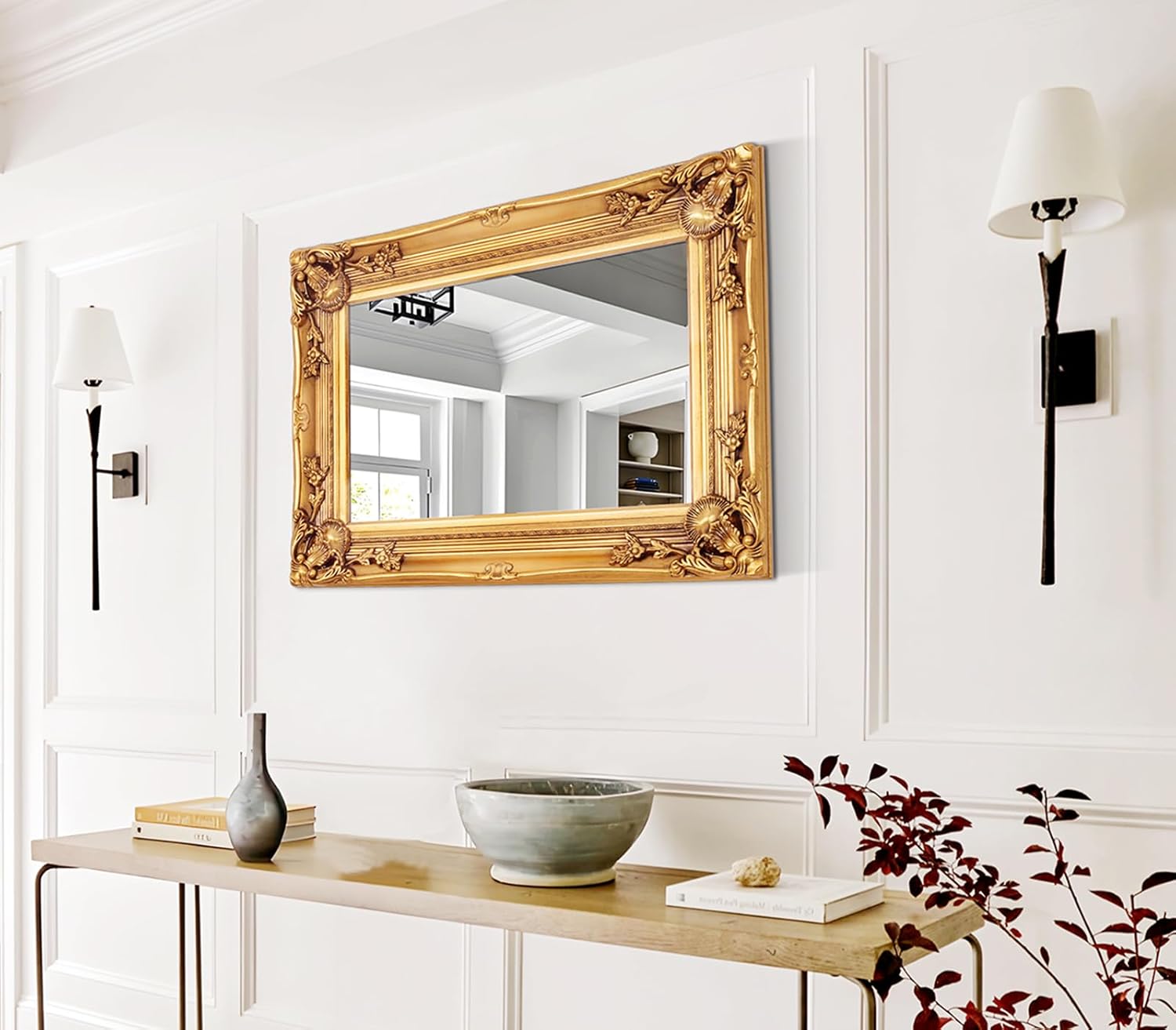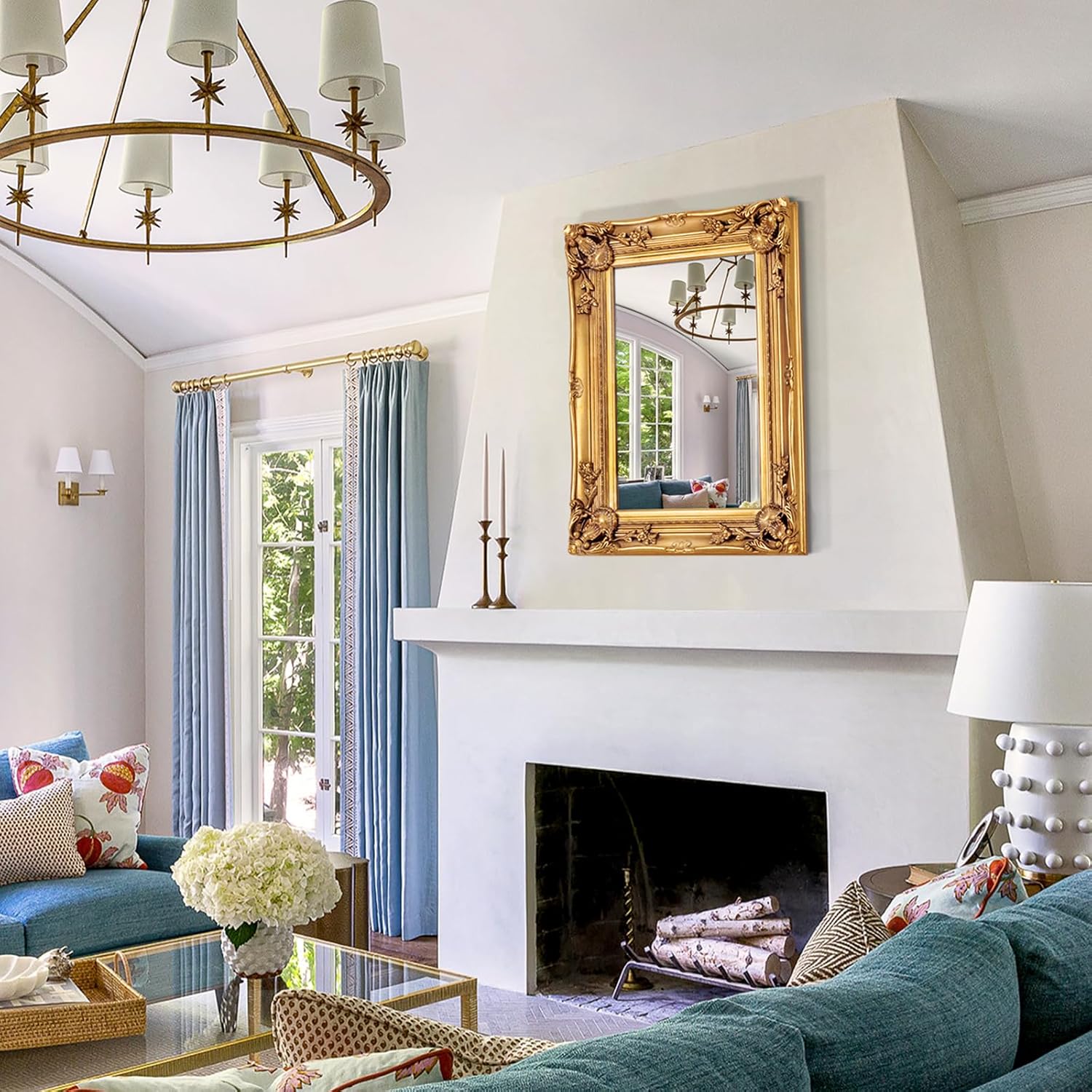 - Luxry Vintage Style: Large living room mirror with dedicate craftmanship. Using ornate gold baroque pattern is an unbelivable idea to create vintage vibes, with a layered silhouette, sophisticated and unobtrusive, enhancing its visual appeal