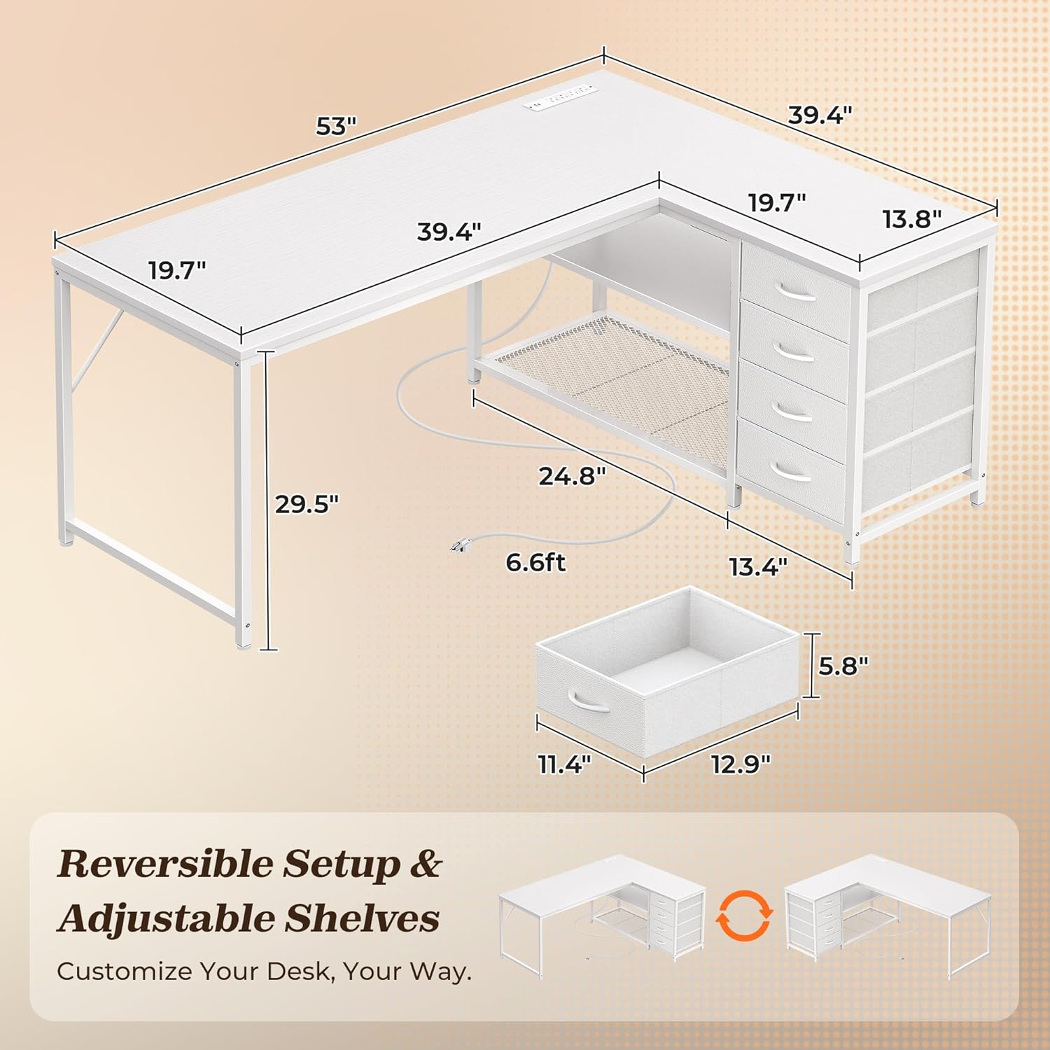 PRAISUN 53" L Shaped Desk with Power Outlets and USB-C Port, Reversible Computer Corner Office Desk with 4 Fabric Drawers and 2 Height-Adjustable Shelves, Large for Gaming Writing Work Study, White