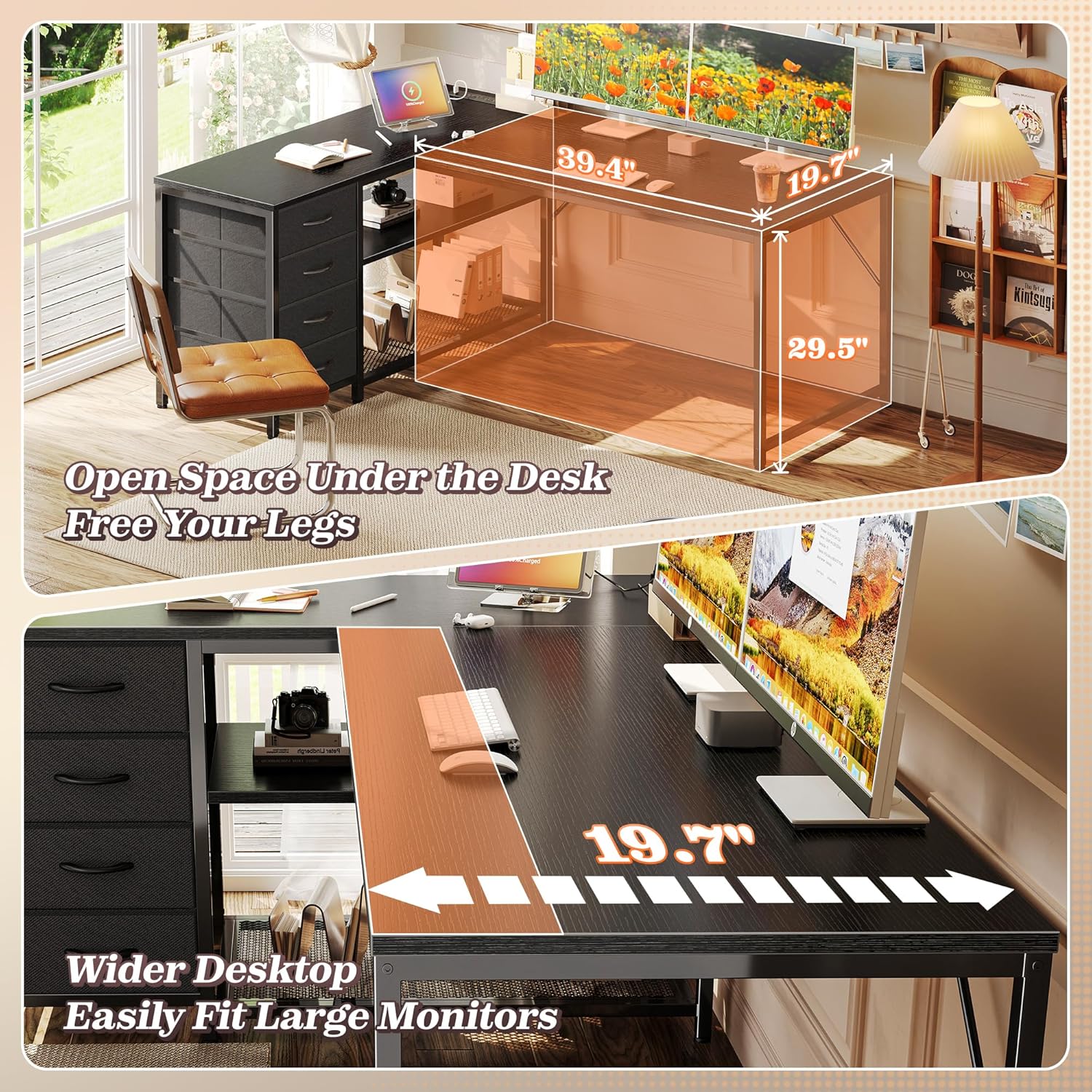 - 【Oversized Desktop & 4-Drawer Storage】Working in a small room? This l shaped office desk offers a wide surface. Main desk fits dual monitors, keyboards, or gaming setups. Side desk holds your printer, notebooks, or a second laptop. 4 fabric drawers and 2 open shelves (adjustable wood & mesh shelf) of the corner gaming desk give you the storage flexibility you need or remove shelves entirely for tower PC space
