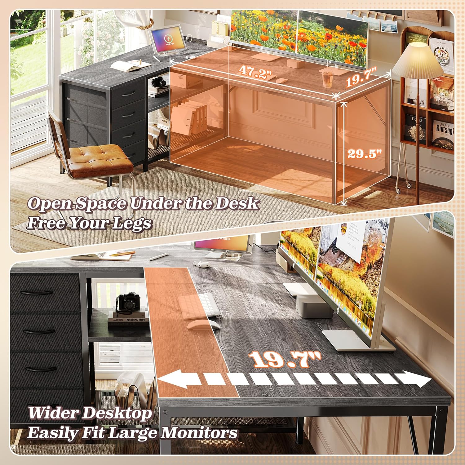 - 【Reversible L Desk with Storage】Utilize your corner space and get 2 distinct work zones with this work desk for home office that adapts to your workflow. Need one side for your laptop and another for your printer, craft projects or gaming setup? This home office desk wraps around you like a command center, giving you more focus than a straight desk ever could. With its reverisble design, this large desk is deal for multitaskers and various home layouts