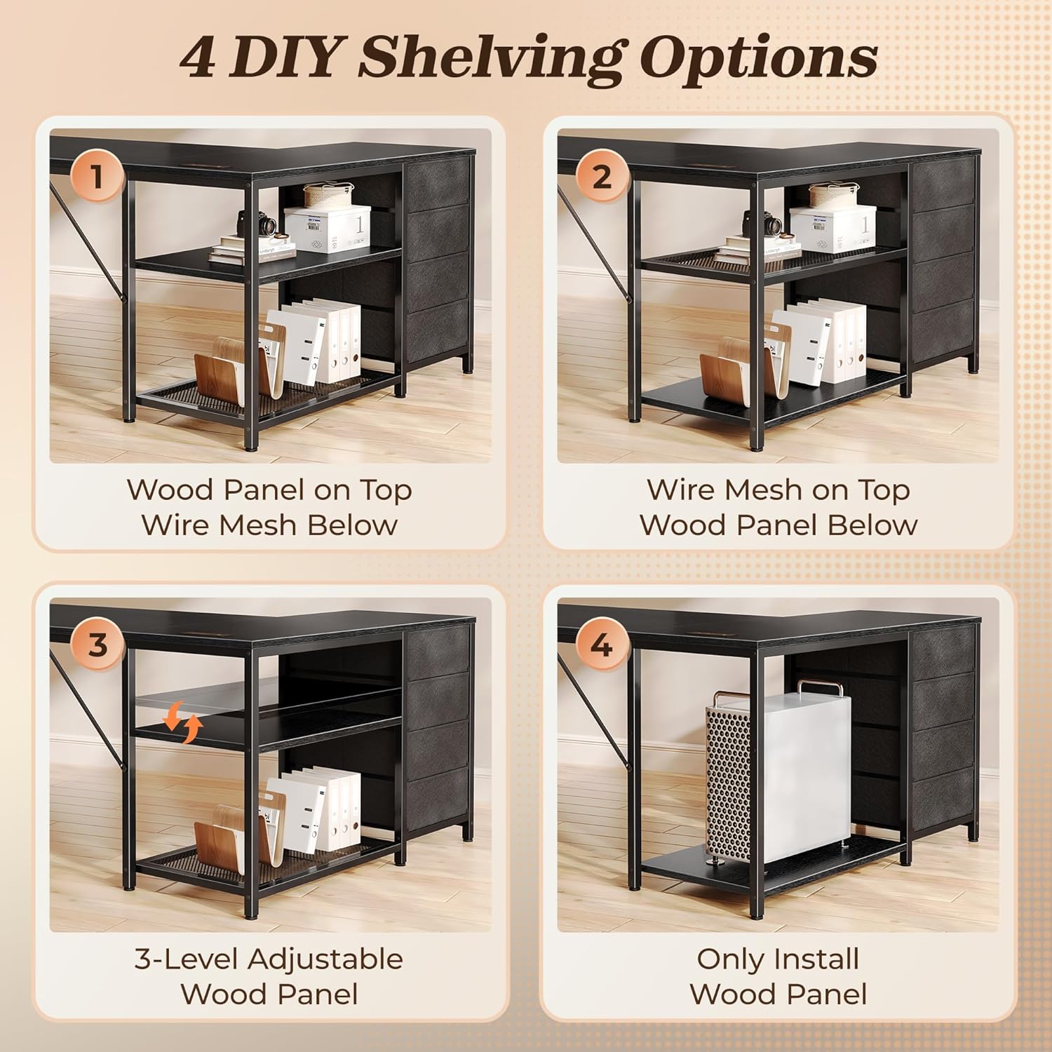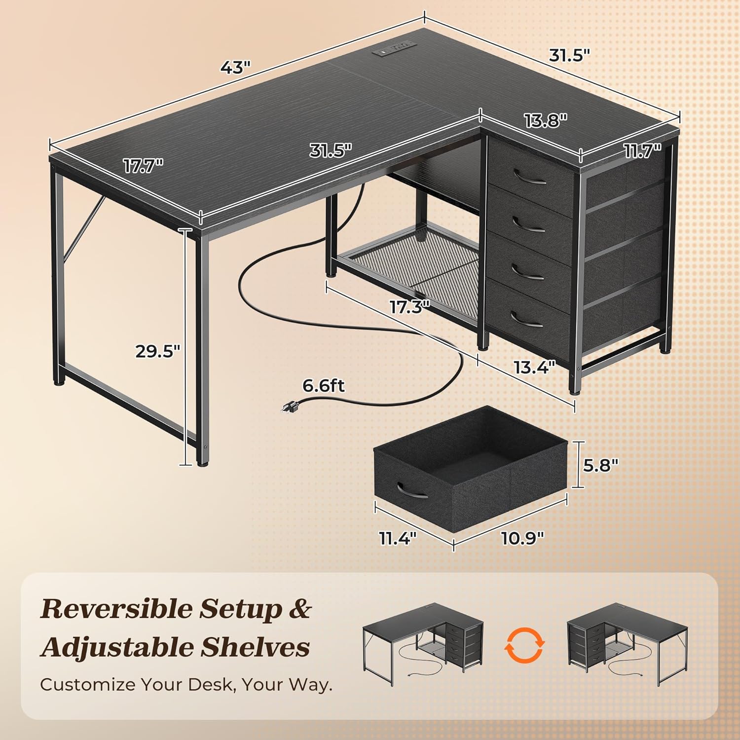PRAISUN 43.3" Small Computer Desk with Power Outlets and USB-C Port, Reversible L Shaped Corner Office Desk with 4 Fabric Drawers and 2 Height-Adjustable Shelves, for Gaming Writing, Black