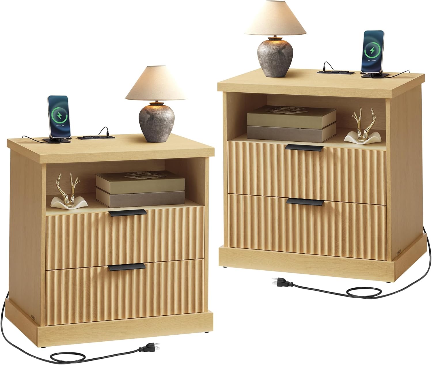 VASAGLE MAXE Collection - Set of 2 Nightstands with Charging Station, Bedside Table, Side End Table with 2 Drawers, Open Shelf, 2 AC Outlets, 2 USB Ports, Transitional, Bedroom, Oak Beige ULET926Y01