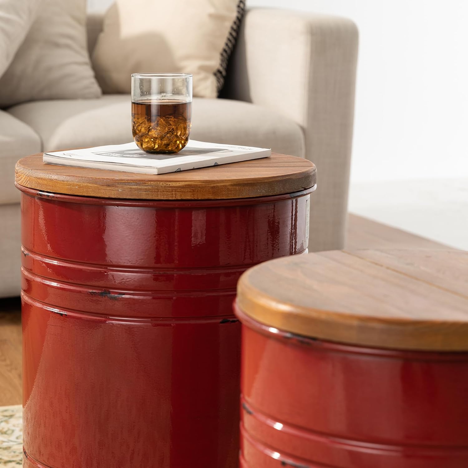 Glitzhome Farmhouse Accent Side Table, Metal Storage Stool Ottoman with Round Lid - Galvanized Coffee Cocktail End Tables Set of 2 for Living Room Bedroom, Red