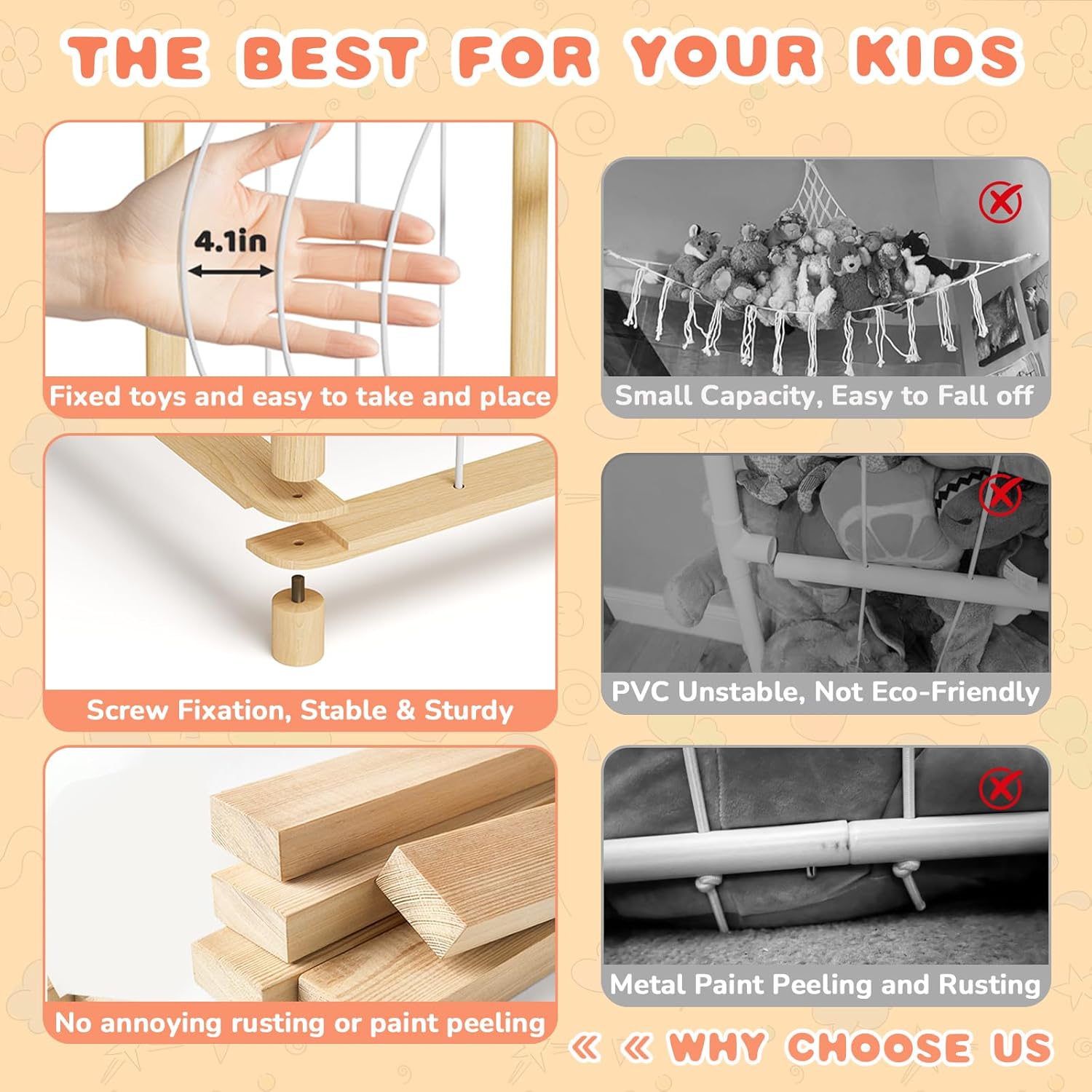 - 【Large Capacity】Our plush toys storage composed of a wood frame and elastic rope floor and walls, which can easy to take out the toys and put them back. Cube dimensions: 16.8″ x 16.8″ x 53.6″ , available fits in 20 medium-sized stuffed toys