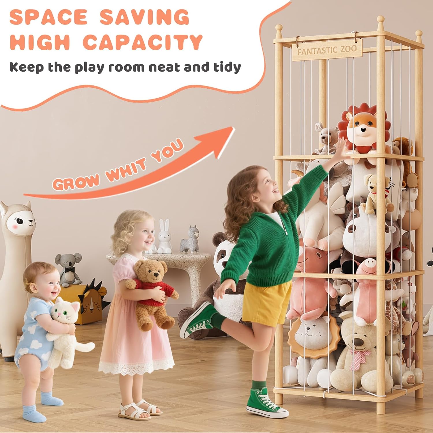 TOPMELON Stuffed Animal Zoo Storage, 16.8″ x 16.8″ x 53.6″ Large Capacity Plush Toy Organizer, Cute Zoo Toy Holder for Kids, Wooden Toys Organizer Tower for Playrooms & Children's Room