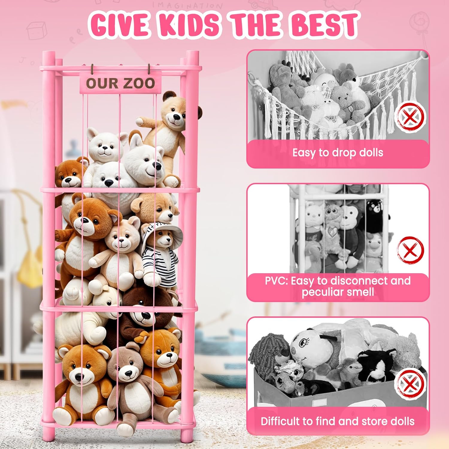Stuffed Animal Storage & Organizer, Wooden Cute Zoo Toy Holder for Toddler Rooms, Playrooms & Bedrooms(Pink)