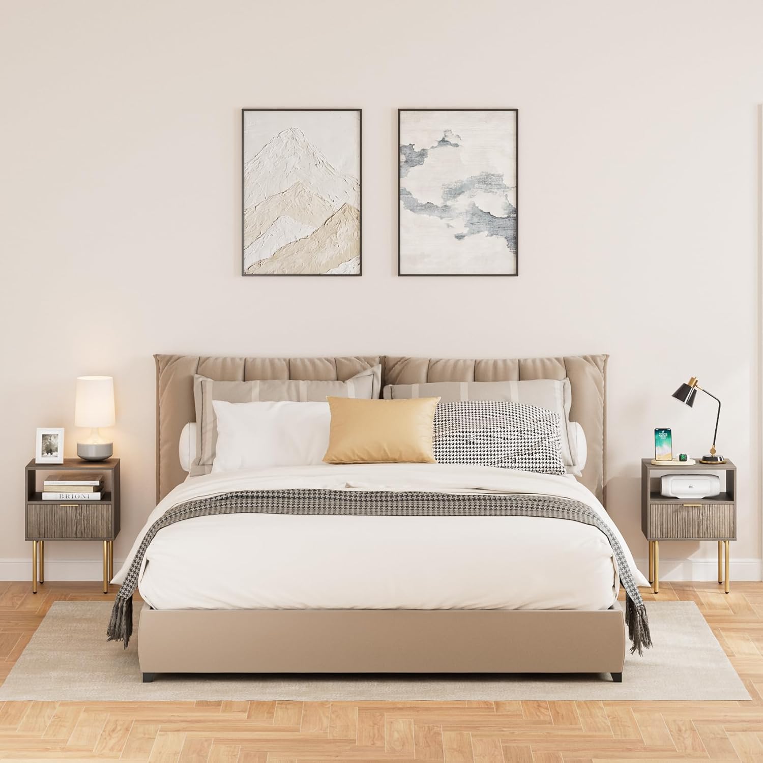 Nightstand,Morden Bedside Table with Gold Frame,Small White Night Stand,End Table,Bedside Furniture,Side Table with Drawer and Shelf for Bedroom,Living Room (1Drawer, Grey)