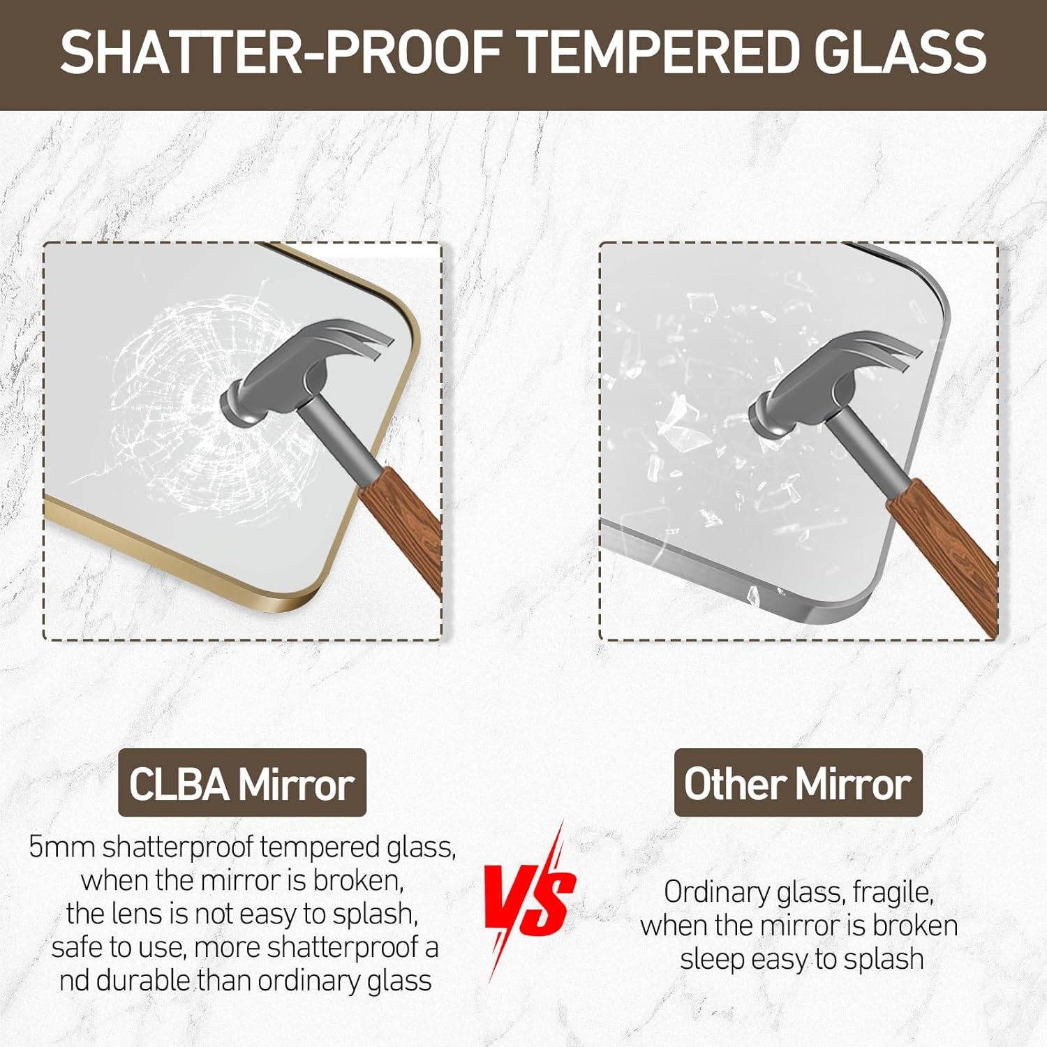 - 【Crystal Clear Reflection】The rectangular mirror uses 4-layer float technology to provide crystal clear reflection, ensuring you see every detail accurately, making it an essential tool for grooming and styling. And the brass mirror is made of 5mm tempered glass, which is shatterproof and explosion-proof to protect you and your family.