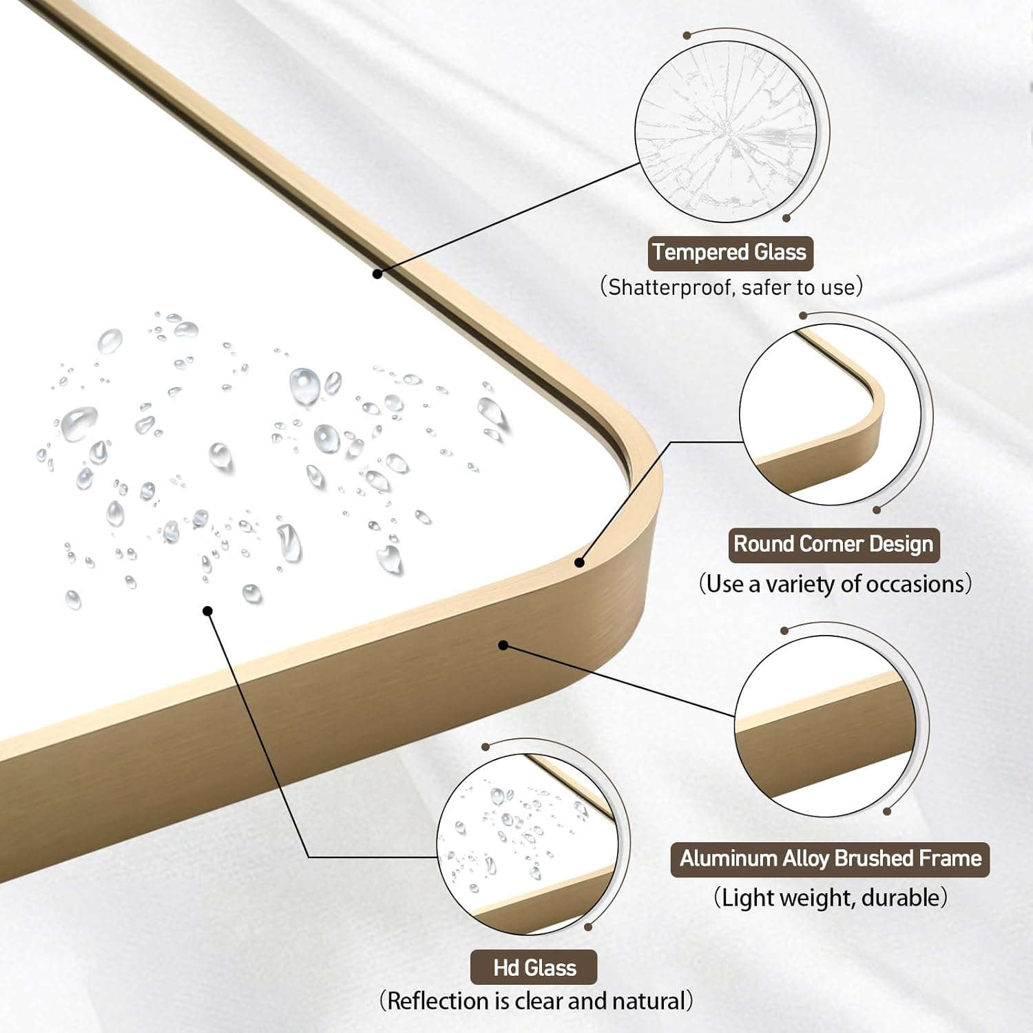 - 【Durable Aluminum Alloy Frame】Featuring a sleek aluminum alloy frame, this brass mirror combines lightweight sturdiness with rust-resistant durability—perfect for humid bathroom environments. The frame’s premium finish complements modern, minimalist, or classic decors, adding a touch of elegance to any space.