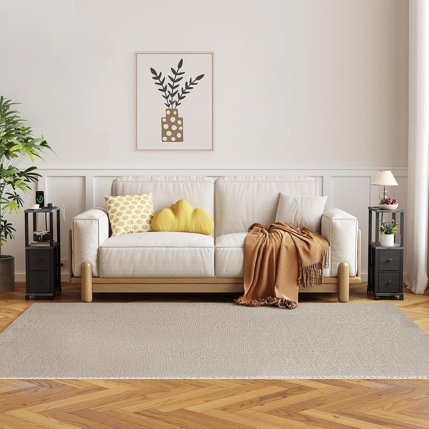 - [Side Table with LED and Charging Station] Narrow side table featuring 1 AC outlet, 1 USB, 1 Type-C port, and a 4.5 ft extension cord for simultaneous charging of phones, lamps, or game consoles. The 2-piece set adds storage beside sofas/bed to maximize space. Built-in LED lighting offers 7 colors, 6 modes, and 5 brightness levels for immersive TV or gaming ambiance.