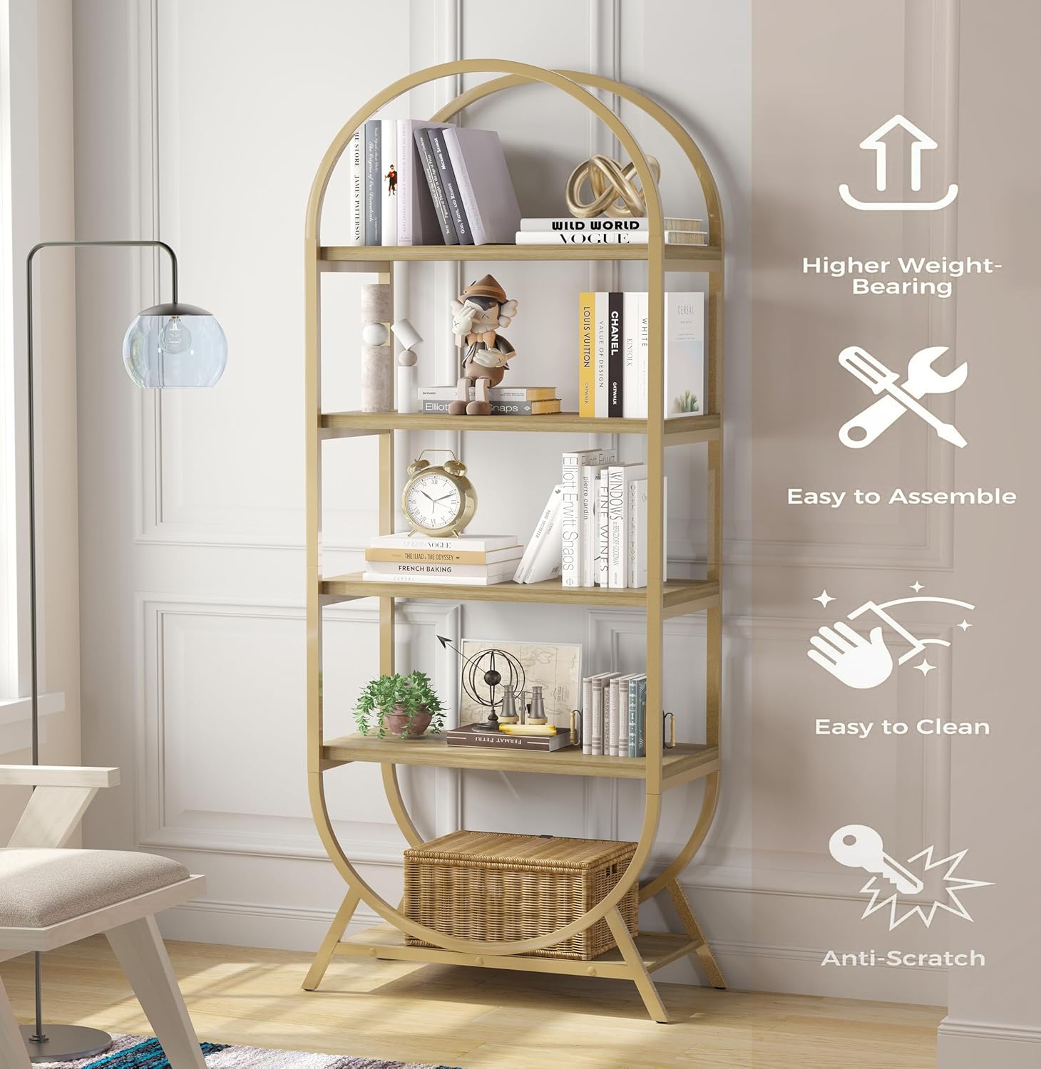 Bookshelf Arched Bookcase, Industrial 5 Tier Open Book Shelves with Metal Frame, 72" Tall Freestanding Display Rack for Home Office, Living Room,Nature Wood and Gold