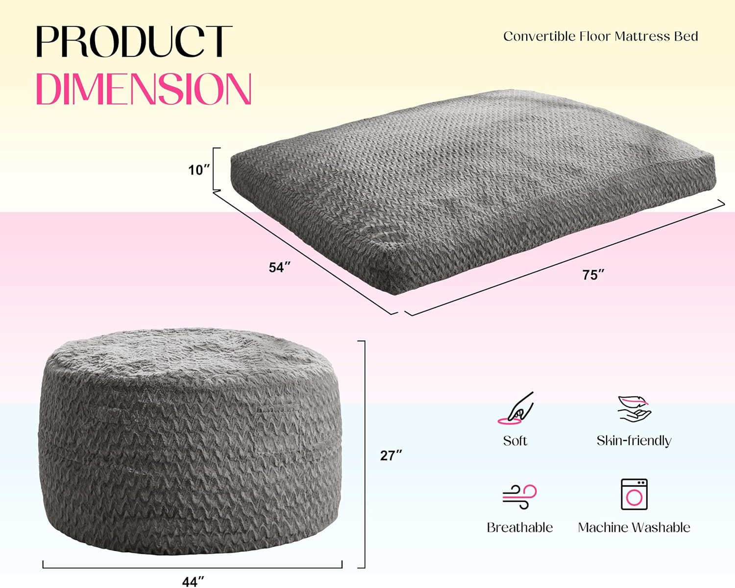 Hobestluk Bean Bag Chair Convertible Beanbag Chairs for Adults, 3 in 1 Bean Bags with Plush Chevron Cover, Adult Bean Bag Chair for Living Room, Bedroom (Grey, Full)