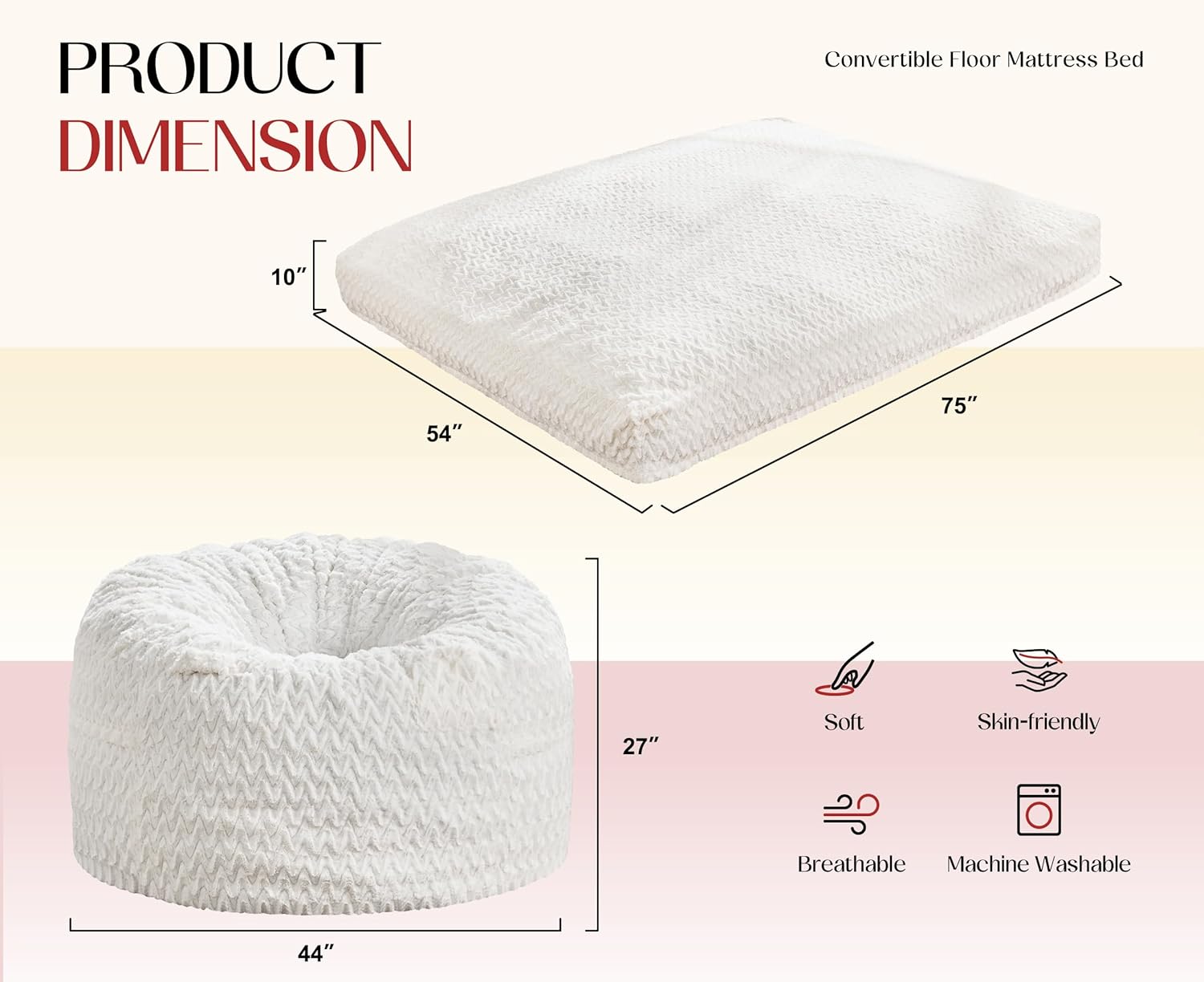 Hobestluk Bean Bag Chair Convertible Beanbag Chairs for Adults, 3 in 1 Bean Bags with Plush Chevron Cover, Adult Bean Bag Chair for Living Room, Bedroom (White, Full)
